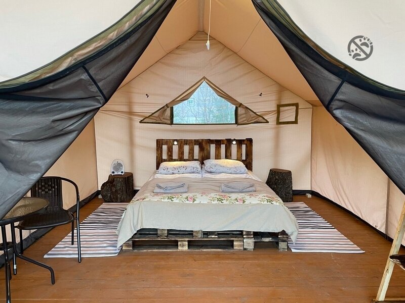 Санузел на территории, мангальная зона, электропростыни, отопление палатки, кухонный уголок с холодильником и чайником.