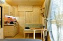 В номере двуспальная кровать, шкаф для одежды, обеденный уголок с диваном, который при желании можно превратить в дополнительное спальное место.