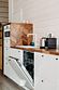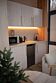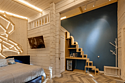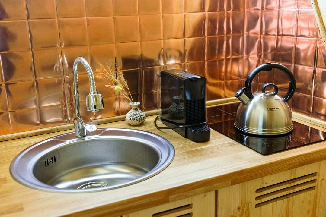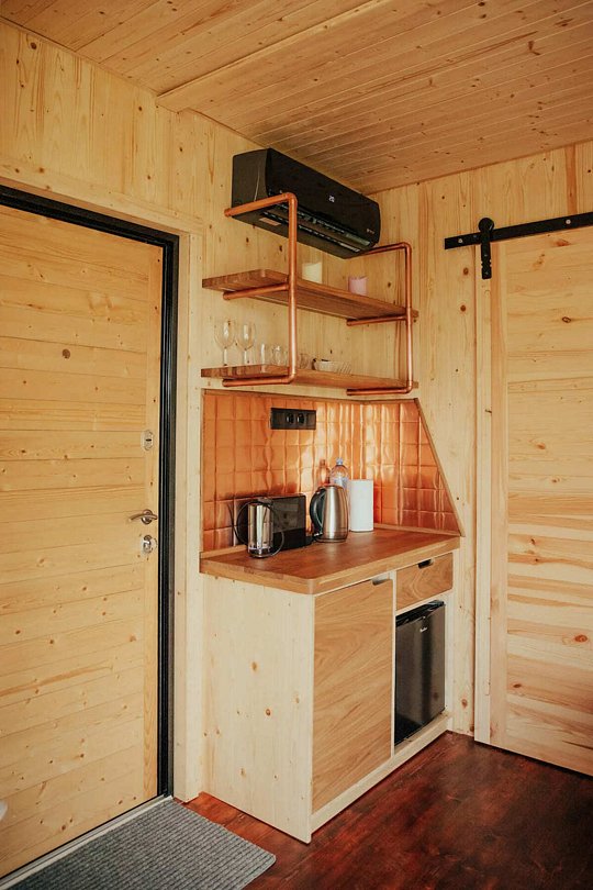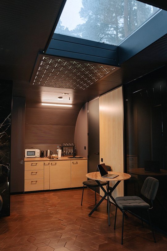 Номер спроектирован как студия и совмещает спальную зону и зону кухни в одном пространстве. На кухне есть полноценный холодильник с морозильной камерой, двухкомфорочная варочная поверхность, микроволновая печь, кофемашина и чайная станция, а также необходимый набор посуды. Этот вариант размещения отличают уютные стильные детали и необычные решения: удивительной формы камин, огромное панорамное окно вместо стены, прозрачная часть крыши над кроватью.