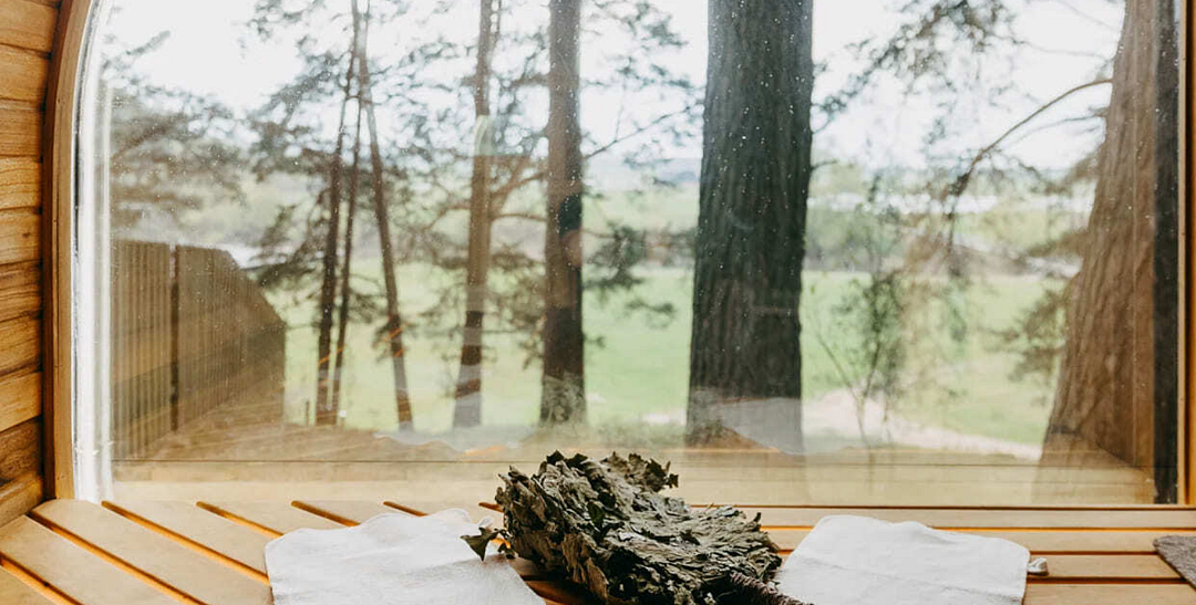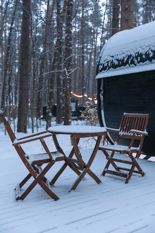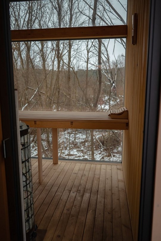 Уютная баня на дровах с большими панорамными окнами спряталась среди сосен, откуда открывается живописный вид на поле и реку. Внутри расположены парилка, комната отдыха, душевая и санузел. Снаружи — открытая веранда, идеальная для отдыха на свежем воздухе.