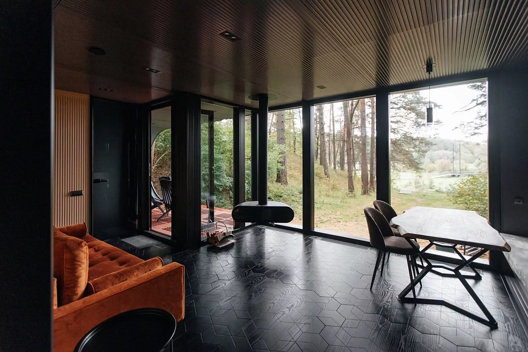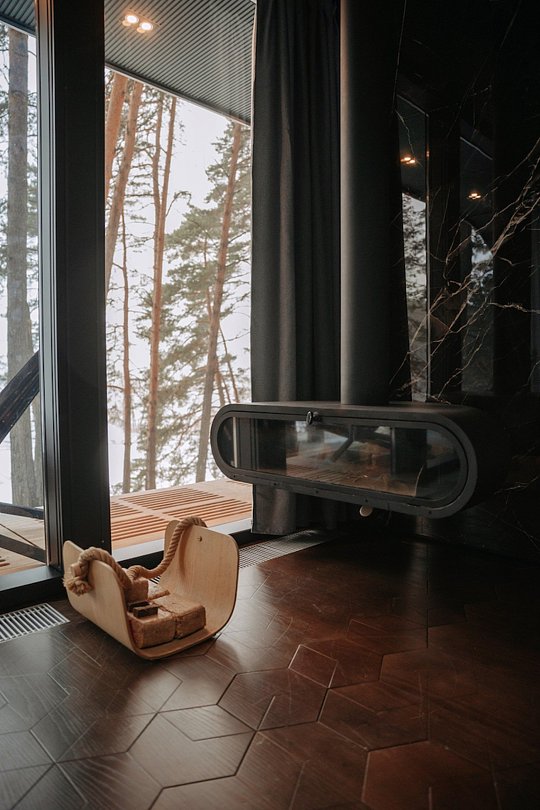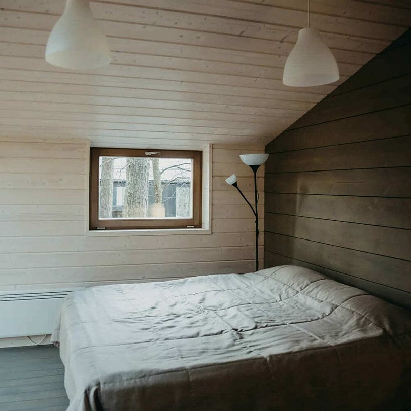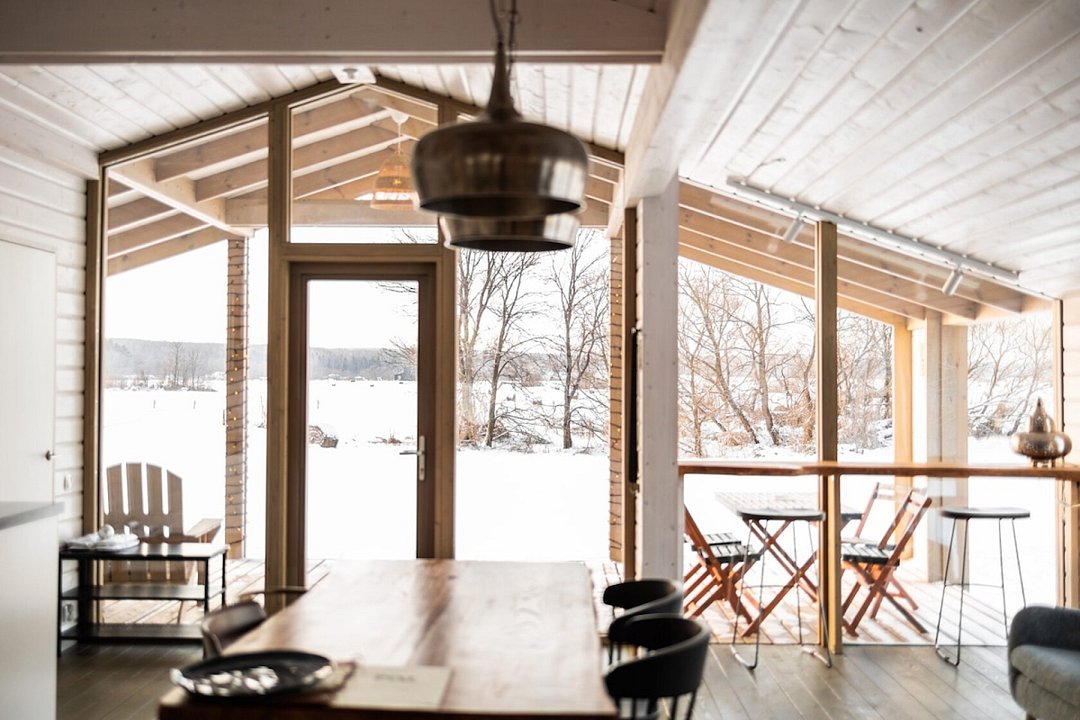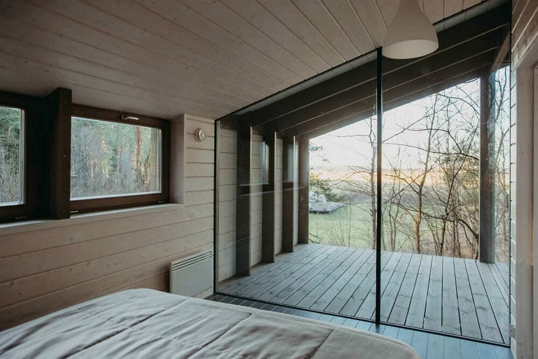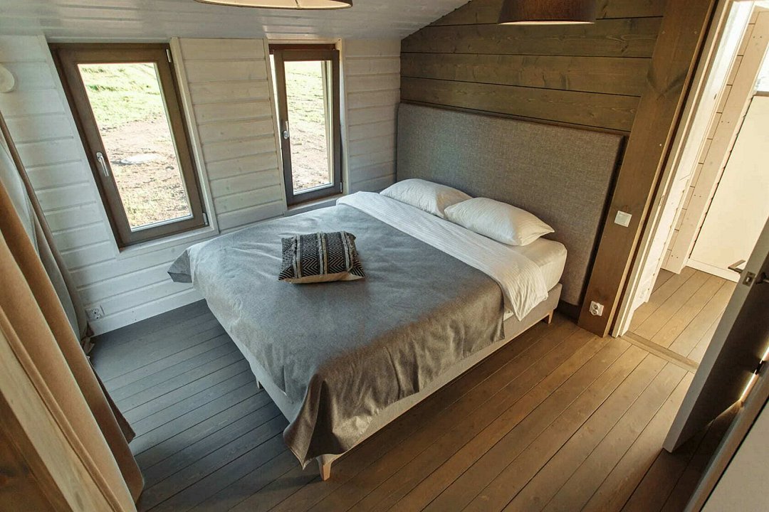 Внутри есть все необходимое для комфортного проживания: спальня с панорамным видом на реку, зона кухни, ванная комната, гардеробная. Дом идеально подходит для проведения романтичных выходных. Стильный и продуманный интерьер, уединенное расположение и красивая природа вокруг.