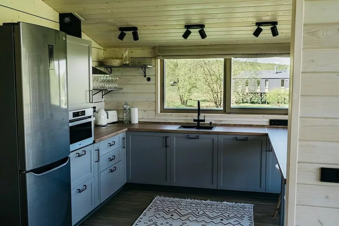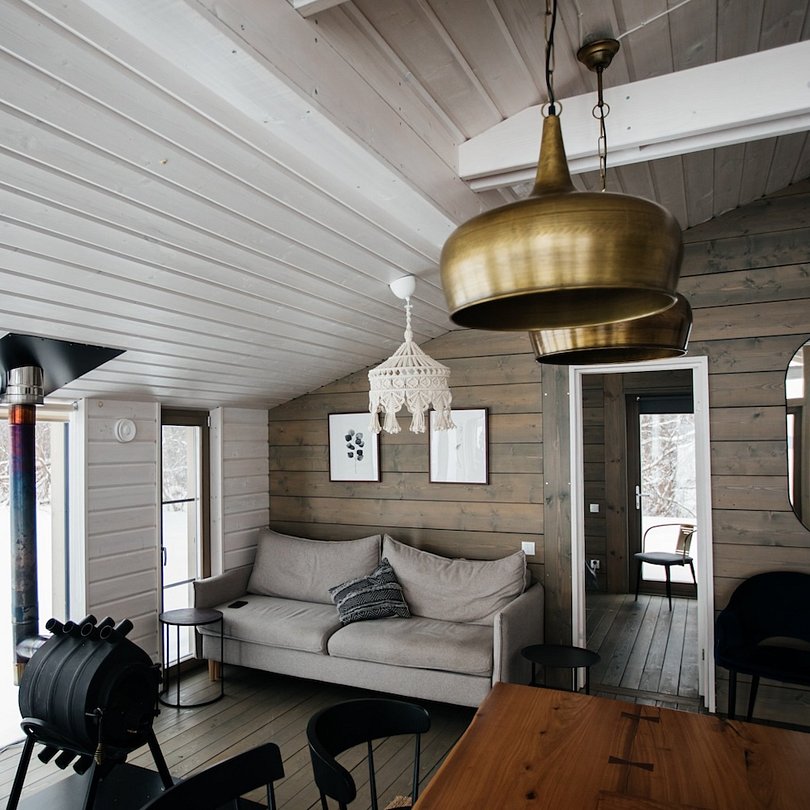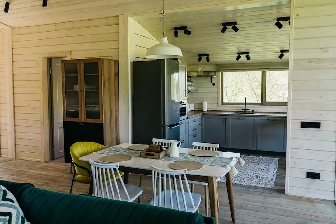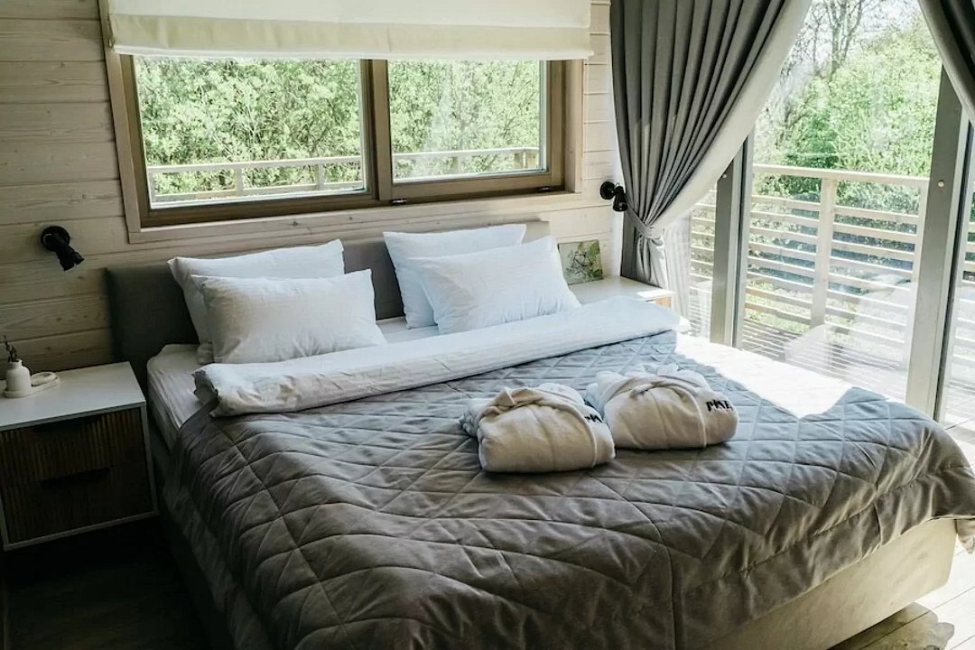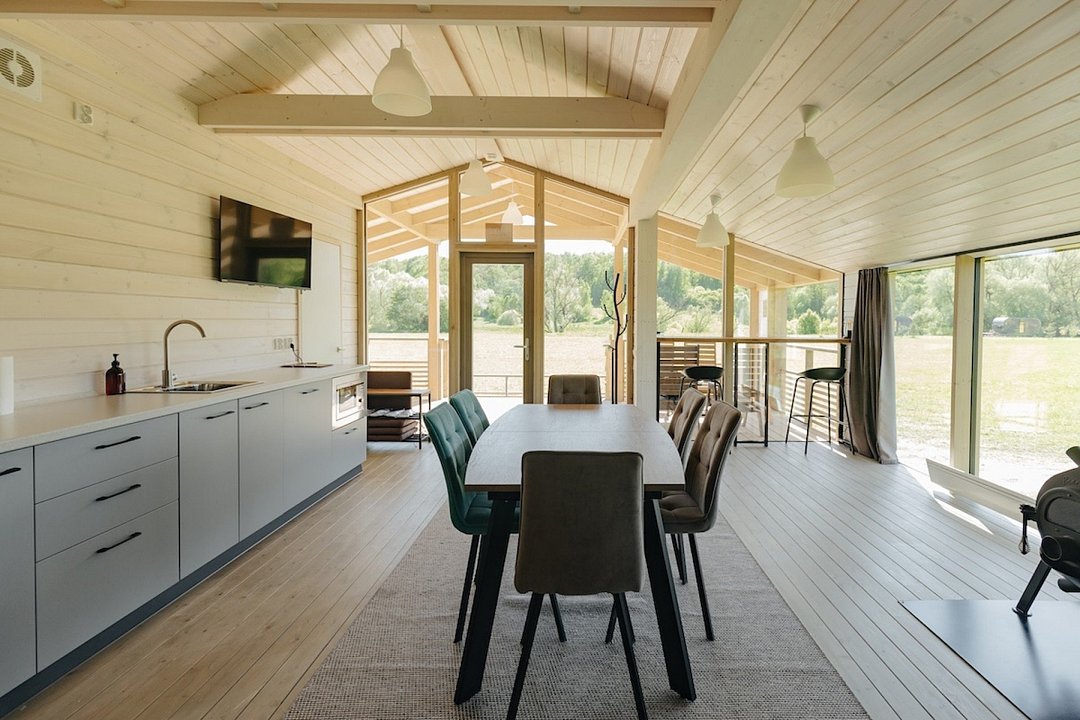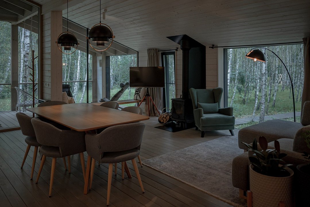 Внутри есть все необходимое для комфортного проживания: спальня с панорамным видом на реку, зона кухни, ванная комната, гардеробная. Дом идеально подходит для проведения романтичных выходных. Стильный и продуманный интерьер, уединенное расположение и красивая природа вокруг.