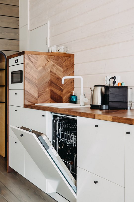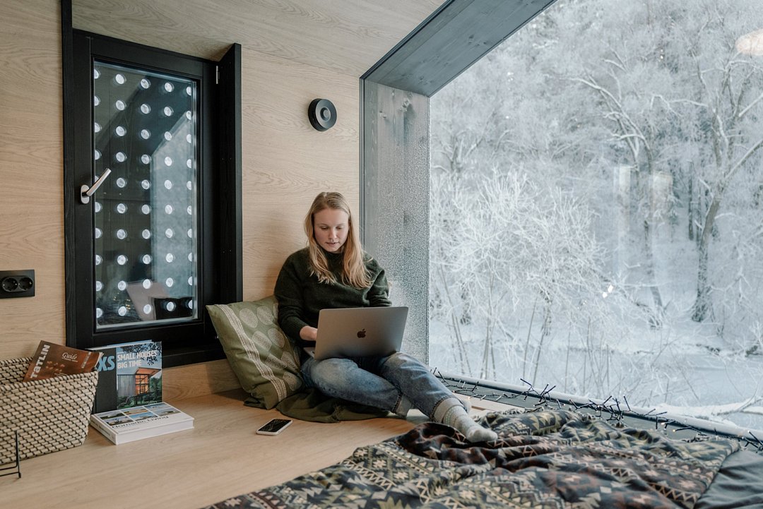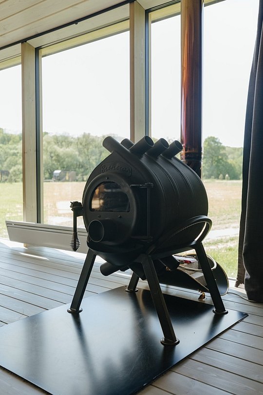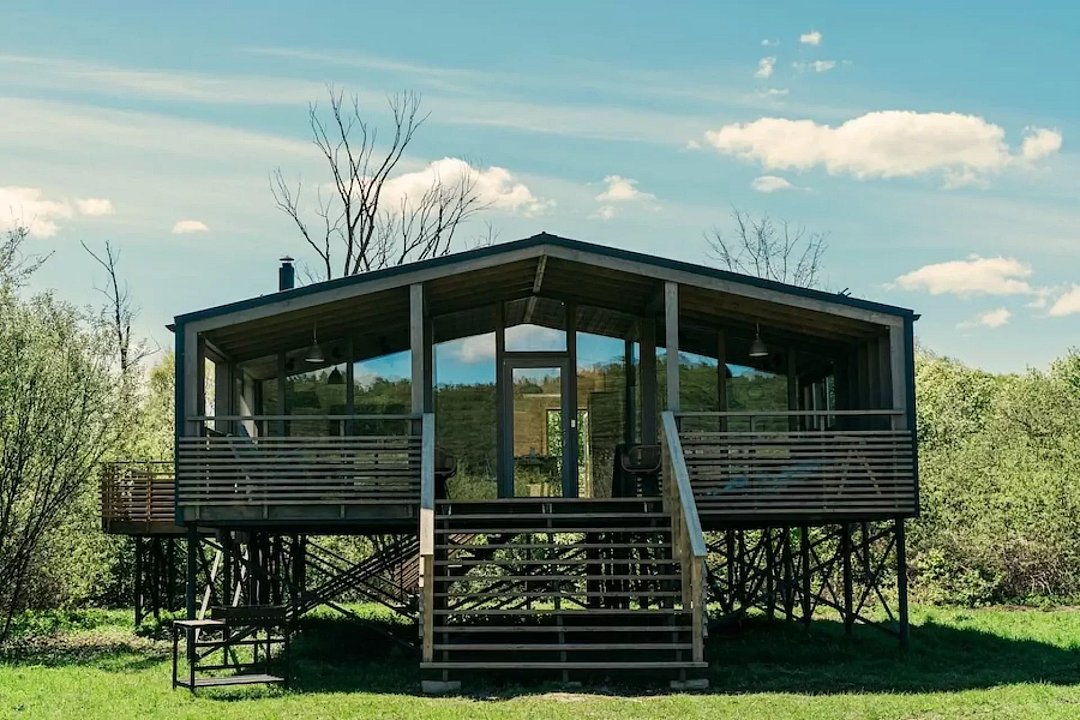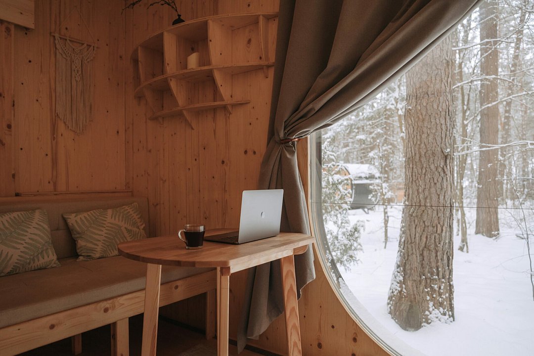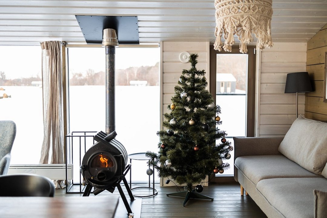 Внутри есть все необходимое для комфортного проживания: спальня с панорамным видом на реку, зона кухни, ванная комната, гардеробная. Дом идеально подходит для проведения романтичных выходных. Стильный и продуманный интерьер, уединенное расположение и красивая природа вокруг.