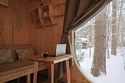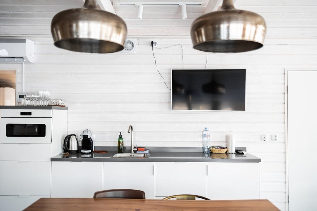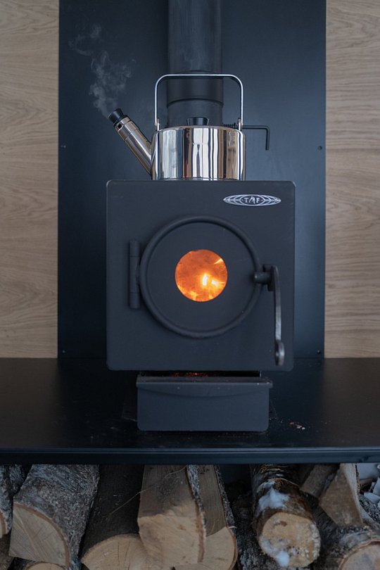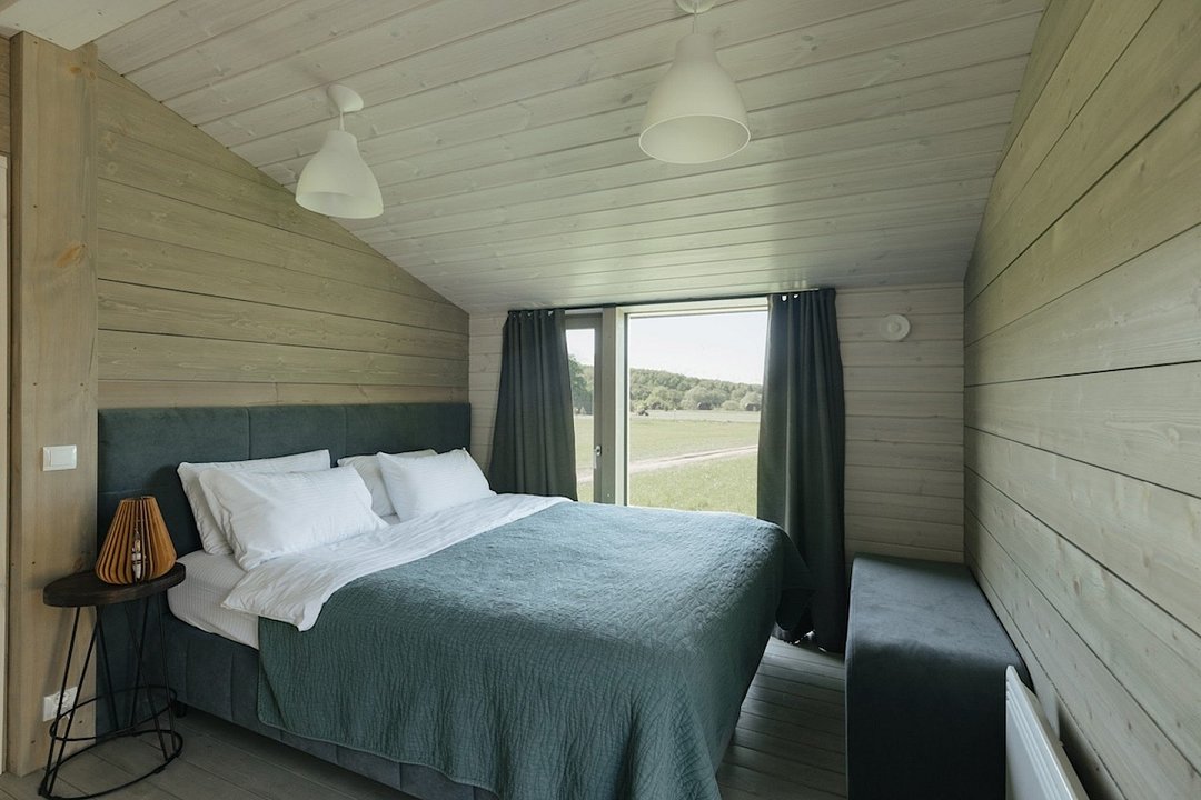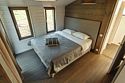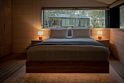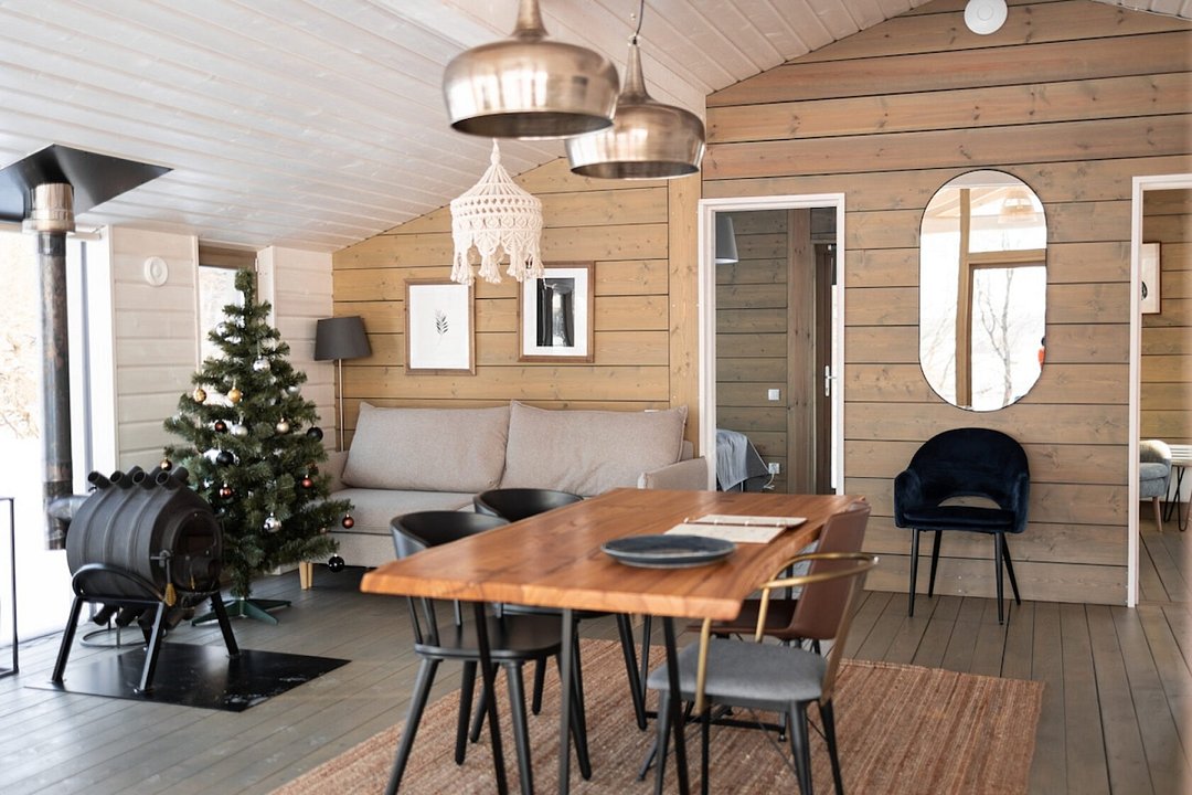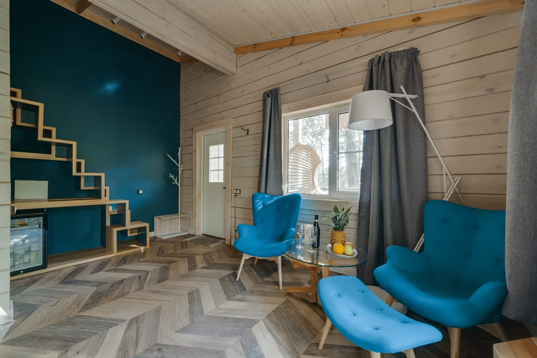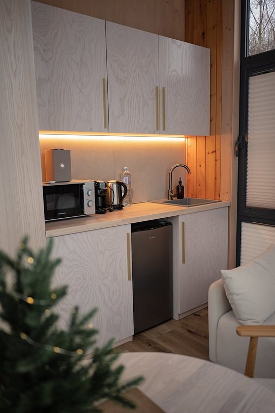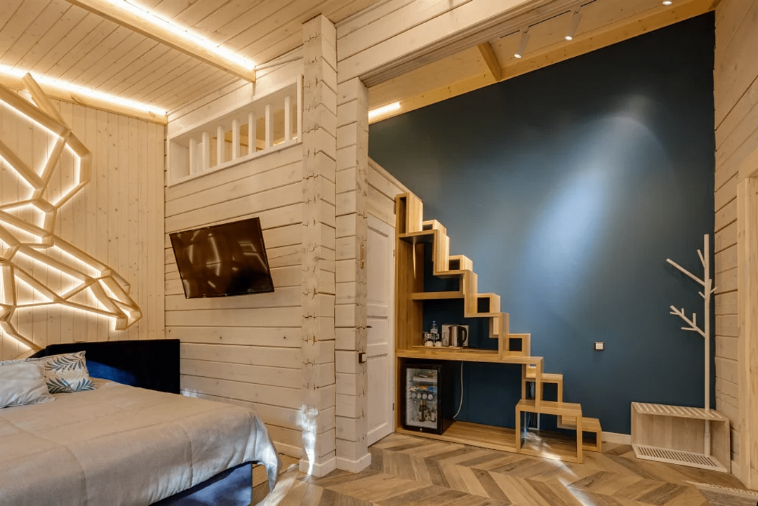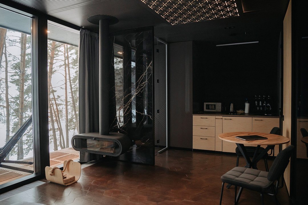 Двухкомнатный номер состоит из спальни и совмещенной кухни с гостиной. На кухне есть полноценный холодильник с морозильной камерой, двухкомфорочная варочная поверхность, микроволновая печь, кофемашина и чайная станция, а также необходимый набор посуды. Этот вариант размещения отличают уютные стильные детали и необычные решения: удивительной формы камин, огромное панорамное окно вместо стены, прозрачная часть крыши над кроватью.