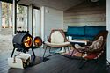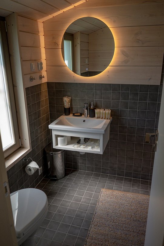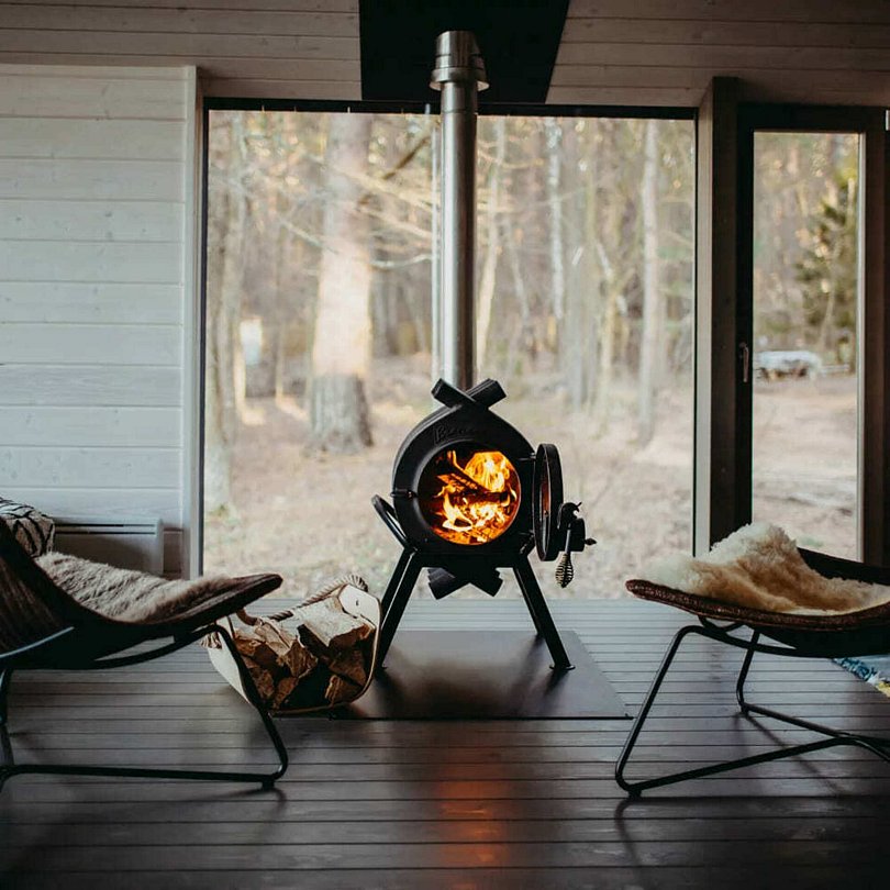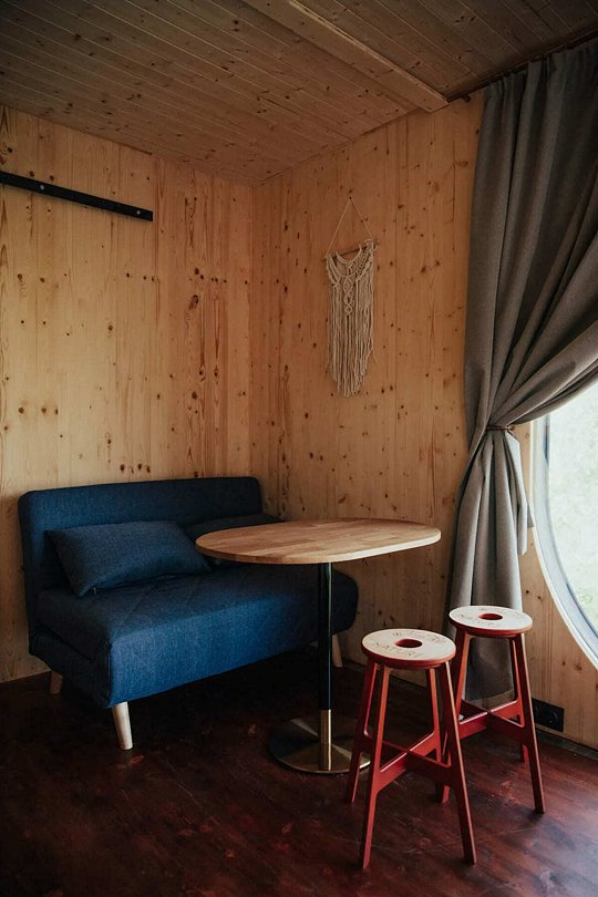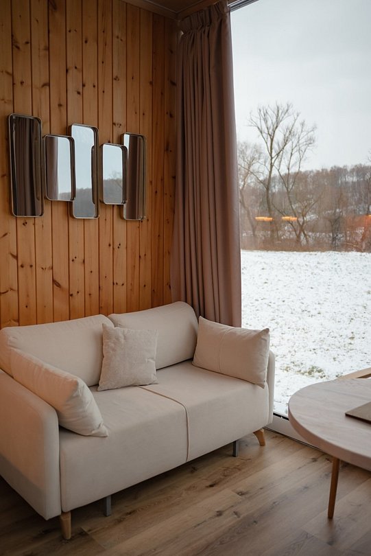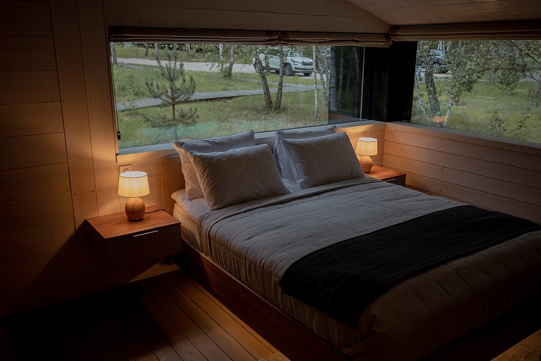 Внутри есть все для комфортного проживания: двуспальная кровать, шкаф, кухонный уголок, санузел с душевой кабиной. Главная изюминка номера - большое панорамное окно с зеркальным покрытием. Возле каждого номера расположена уютная зона отдыха с костровой чашей, мангалом и шезлонгами.