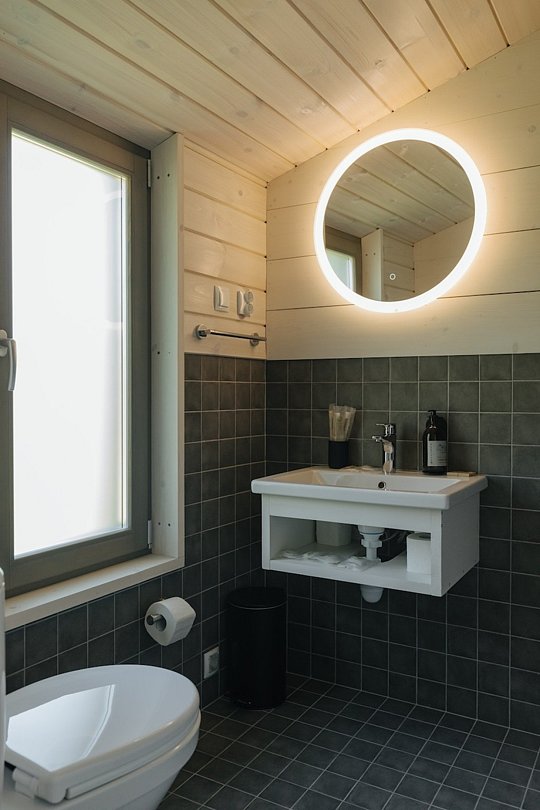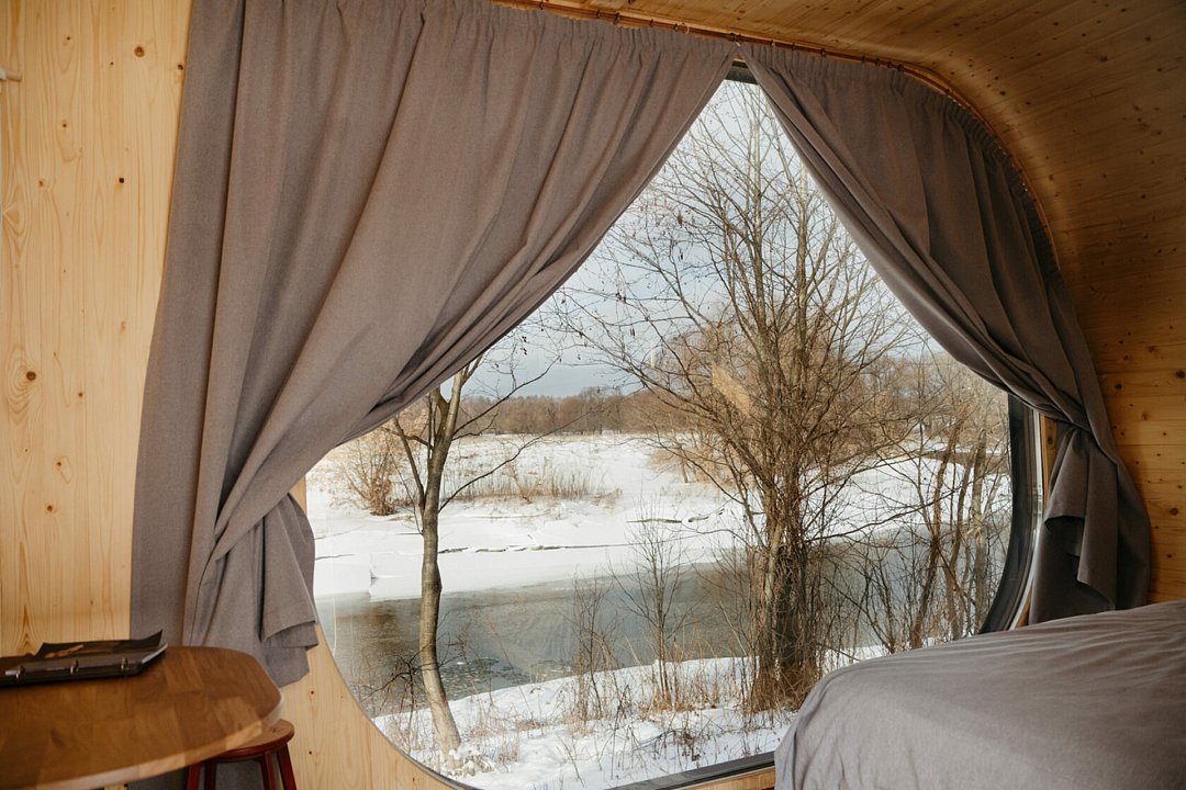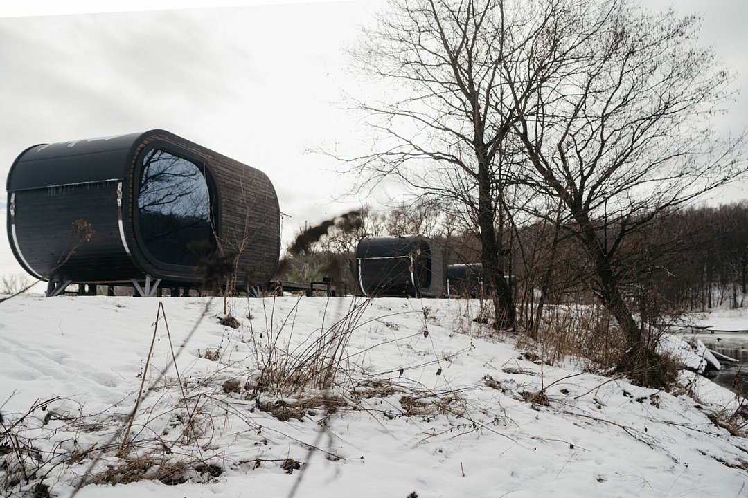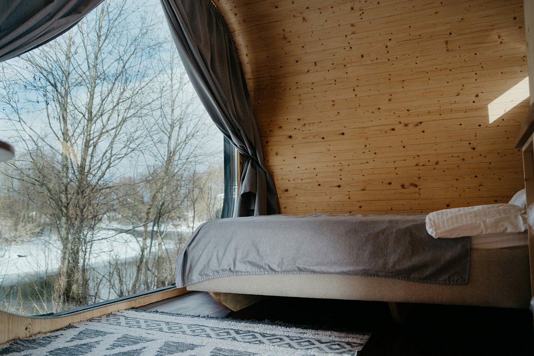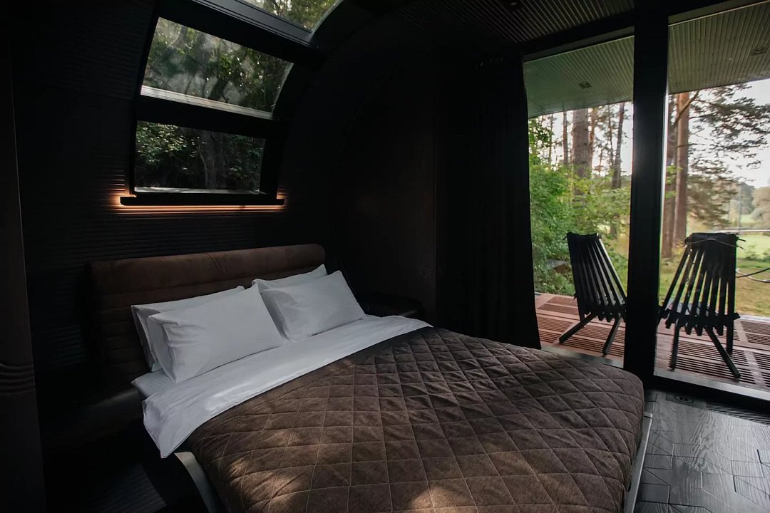 Уютный, отдельно стоящий домик-капсула на берегу реки. Большое панорамное окно — изюминка номера — защищено от посторонних взглядов зеркальным напылением. Комфортное проживание для двоих.