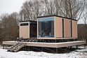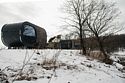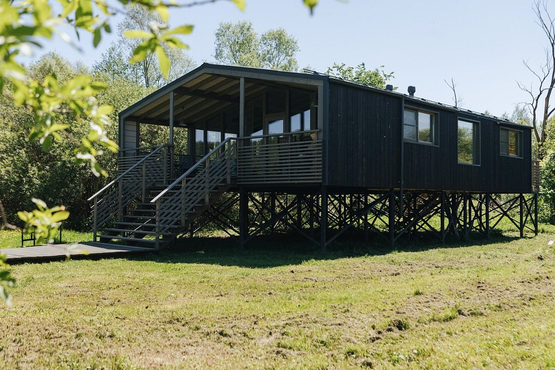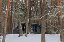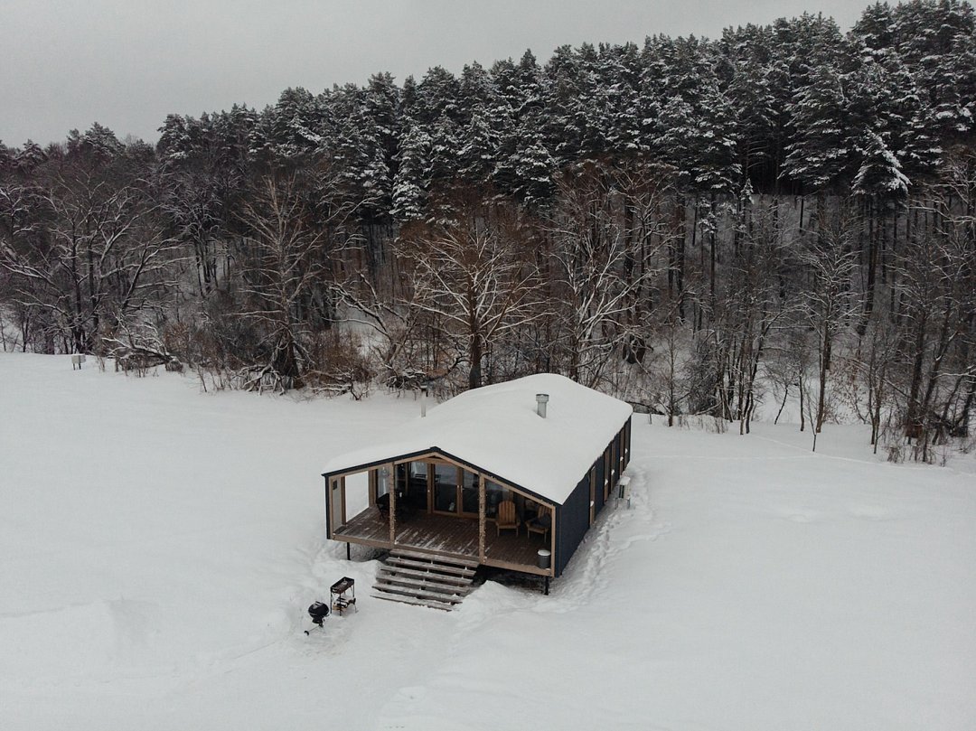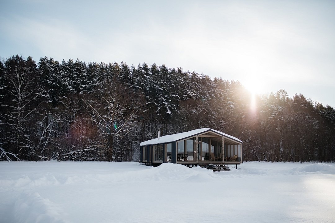 Современный дом-студия площадью 27 кв. м расположен в живописном поле прямо на высоком берегу реки.