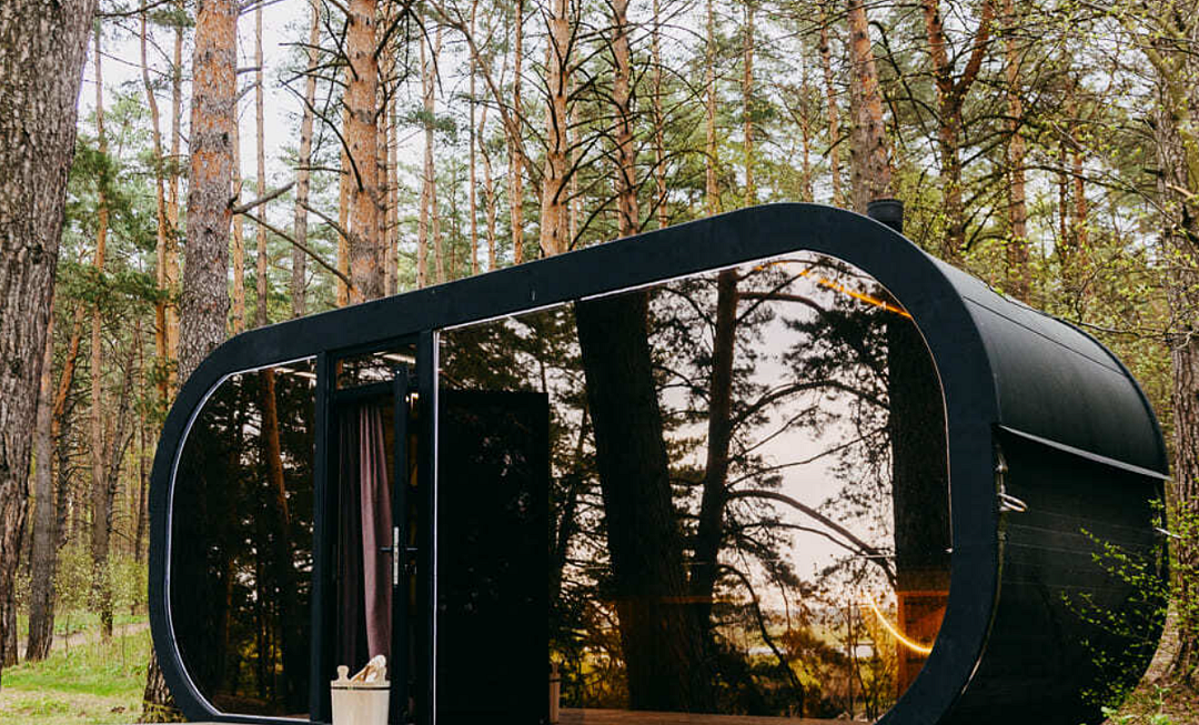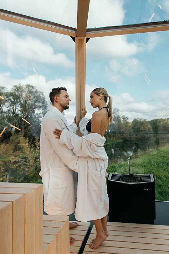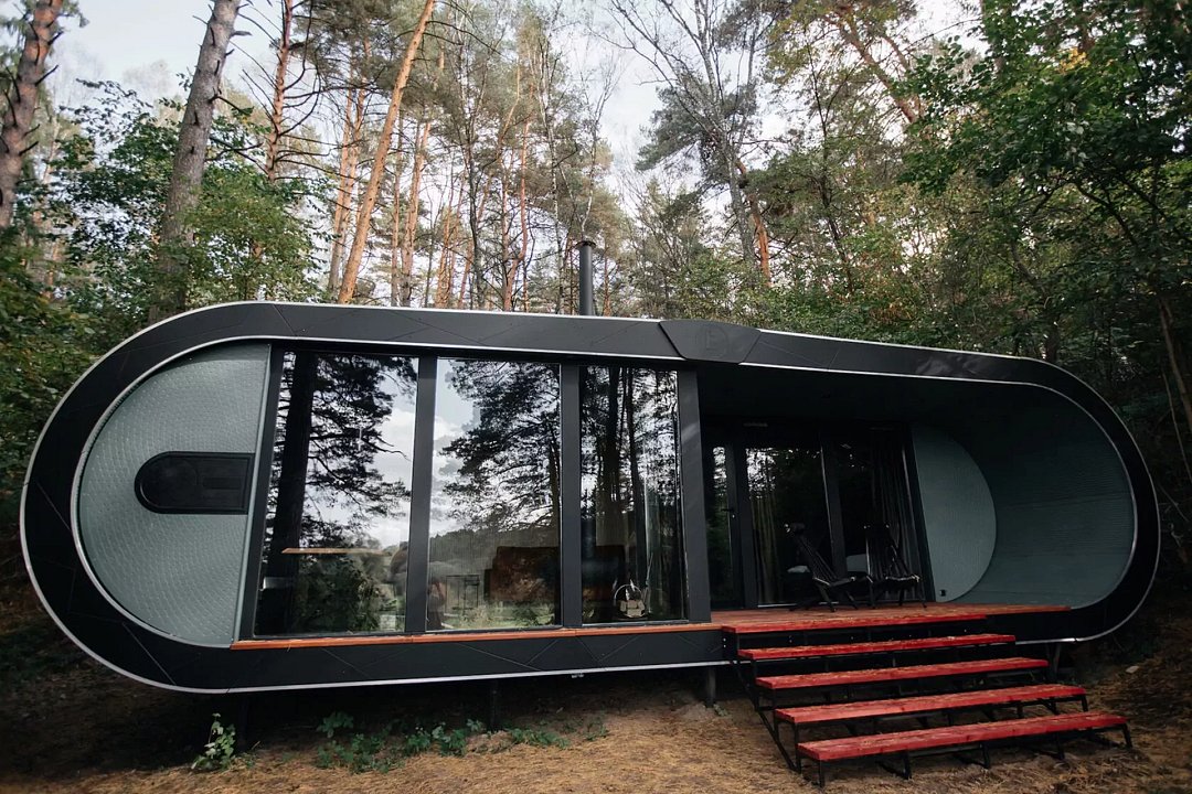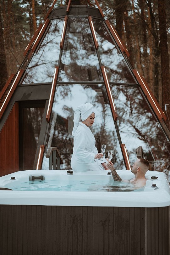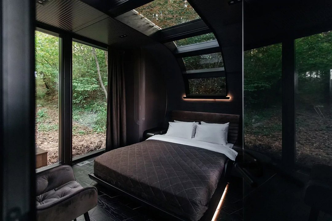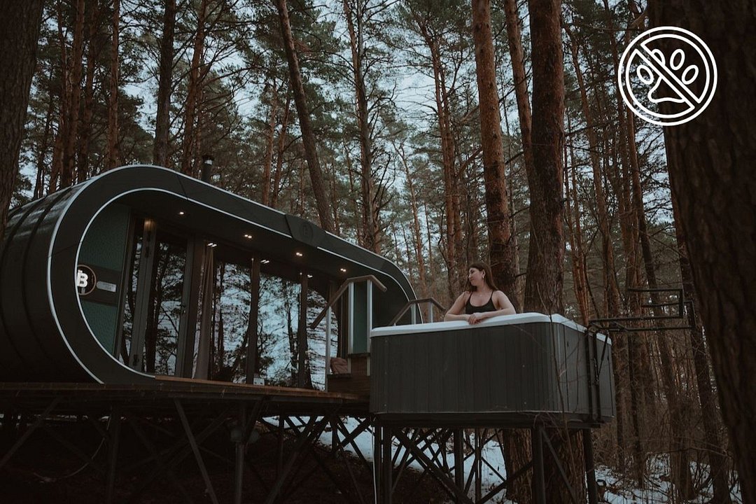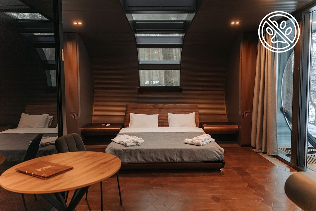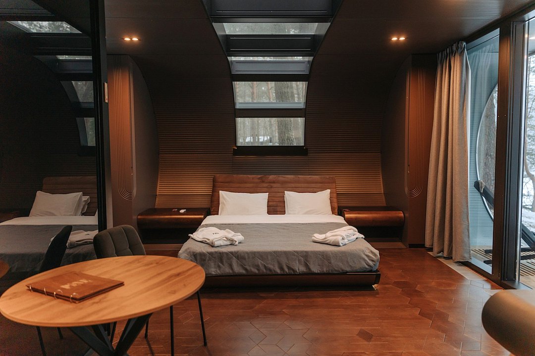 Футуристичный панорамный дом из экологичных материалов. Внутри есть все для комфортного проживания: двуспальная кровать, кухонный уголок, санузел с душевой кабиной. Главная отличительная особенность номера — собственная электрическая сауна и всесезонная гидромассажная ванна на террасе с прекрасным видом. Сауна оборудована комнатой отдыха с удобным диваном