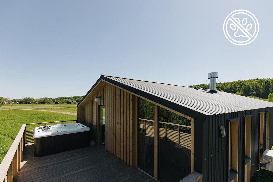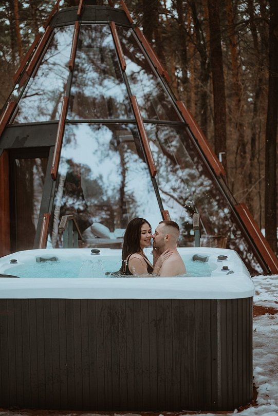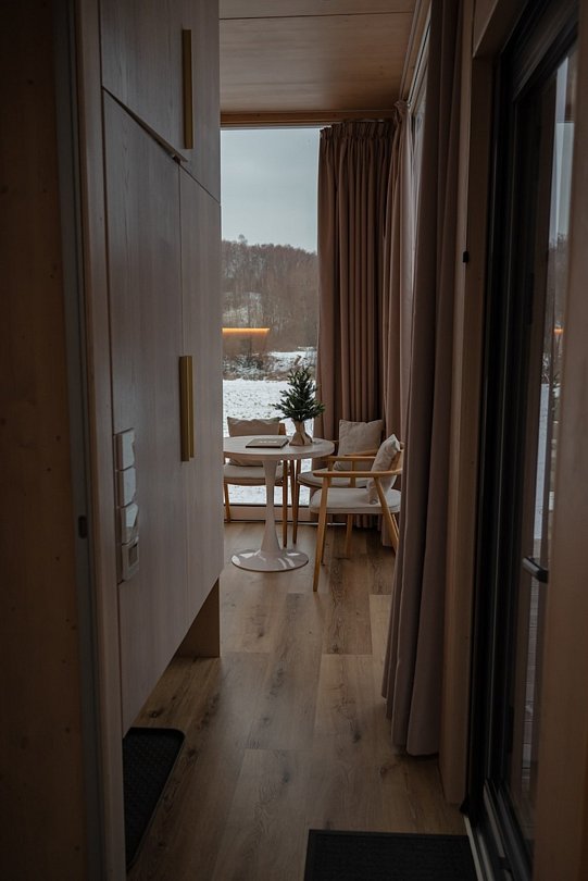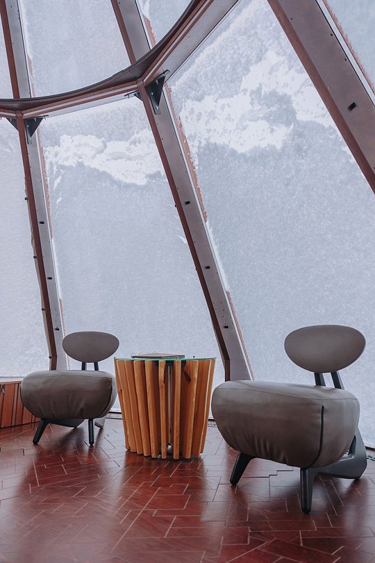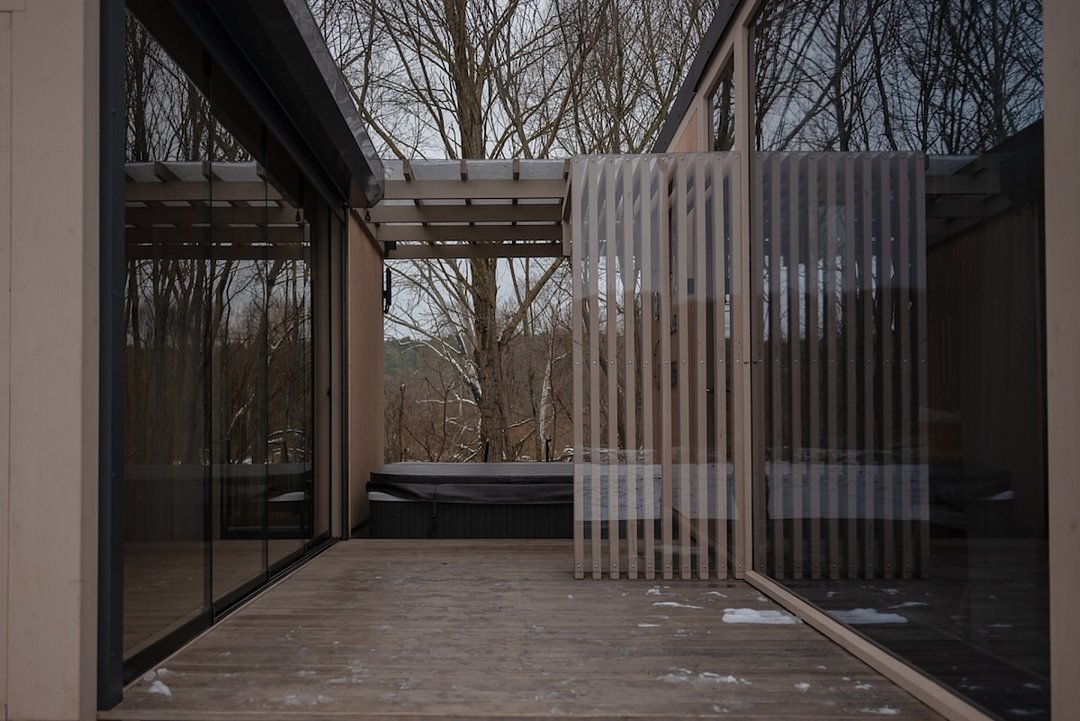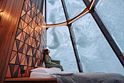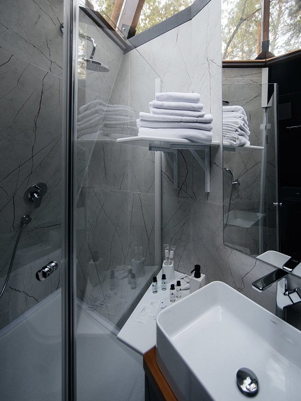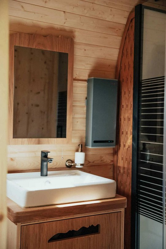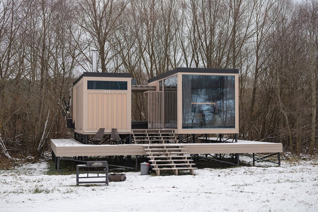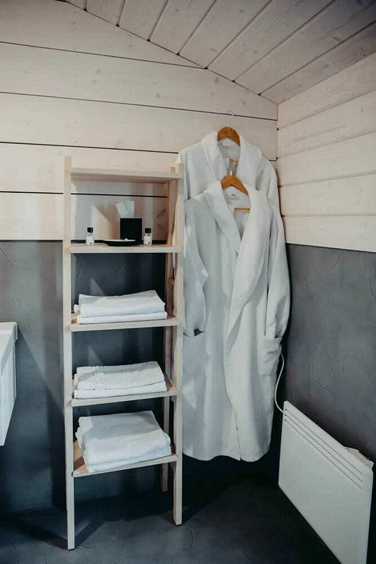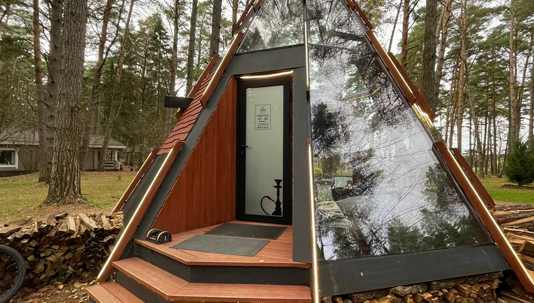 Футуристичный панорамный дом из экологичных материалов. Внутри есть все для комфортного проживания: двуспальная кровать, кухонный уголок, санузел с душевой кабиной. Главная отличительная особенность номера — собственная электрическая сауна и всесезонная гидромассажная ванна на террасе с прекрасным видом. Сауна оборудована комнатой отдыха с удобным диваном