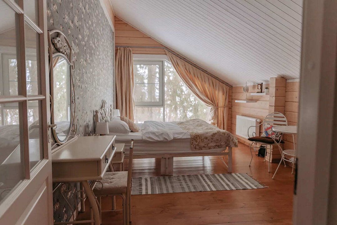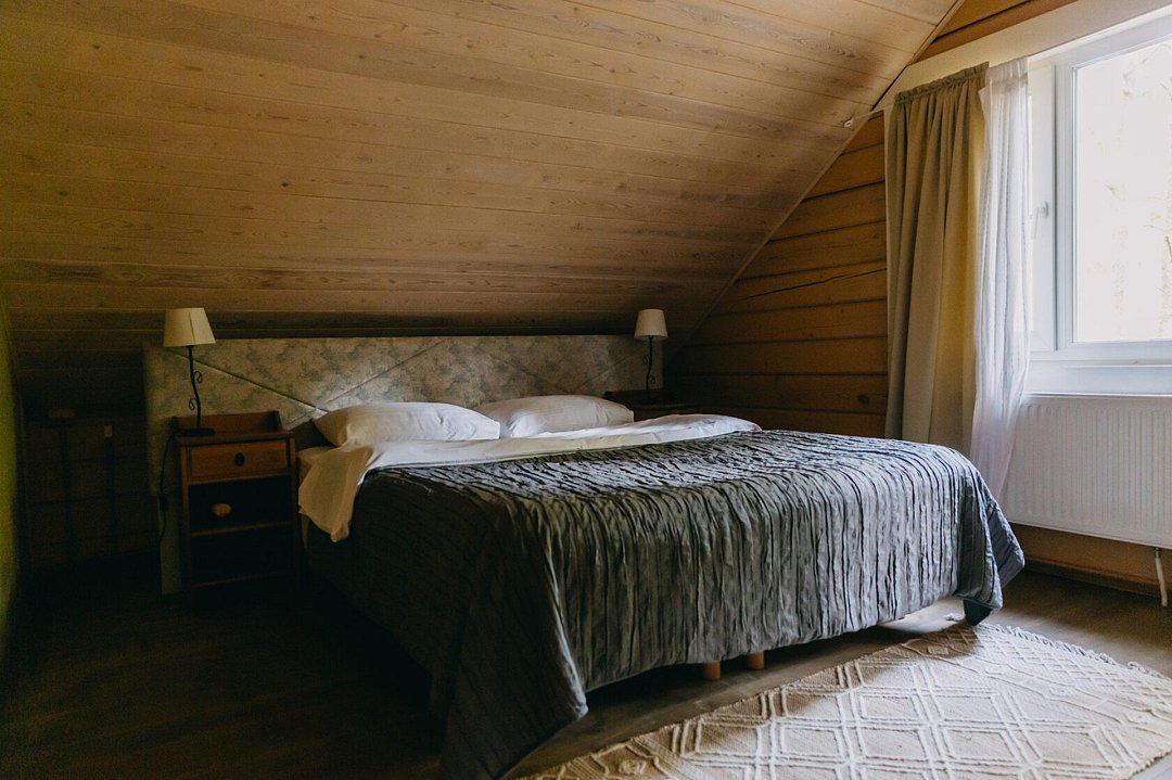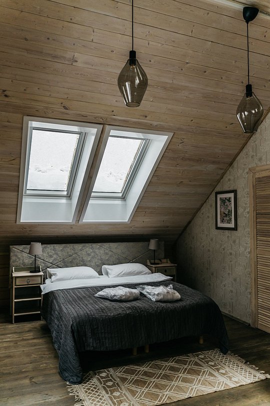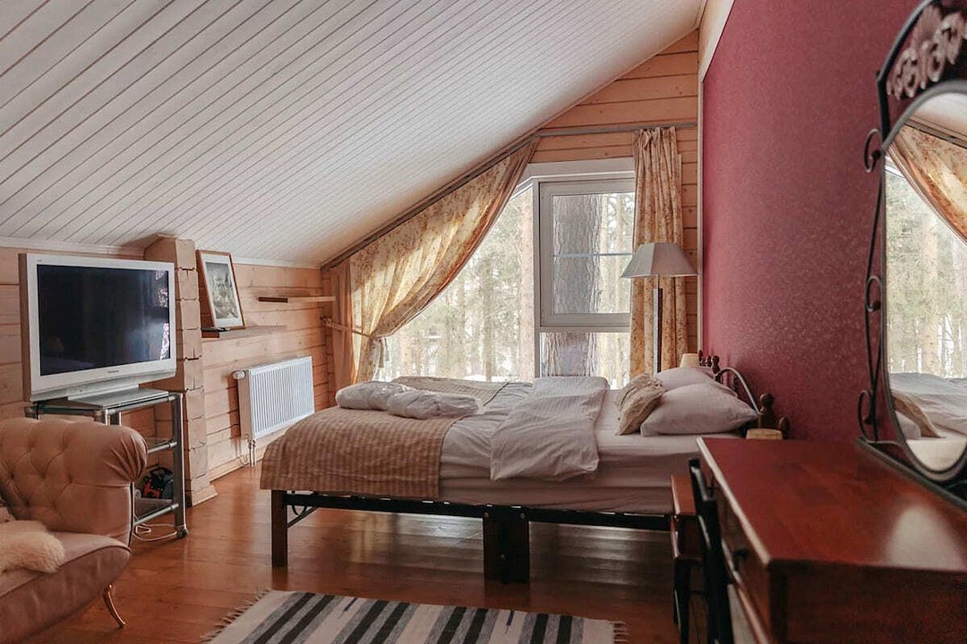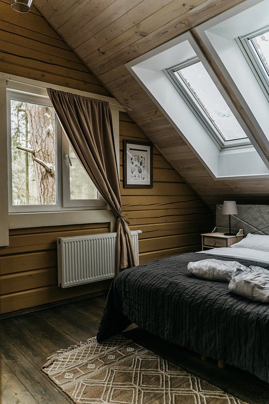 Большой двухэтажный номер — оптимальный вариант для комфортного отдыха небольшой семьи. Окна номера выходят на лесную территорию, на втором этаже — уютная спальня с мансардным окном.