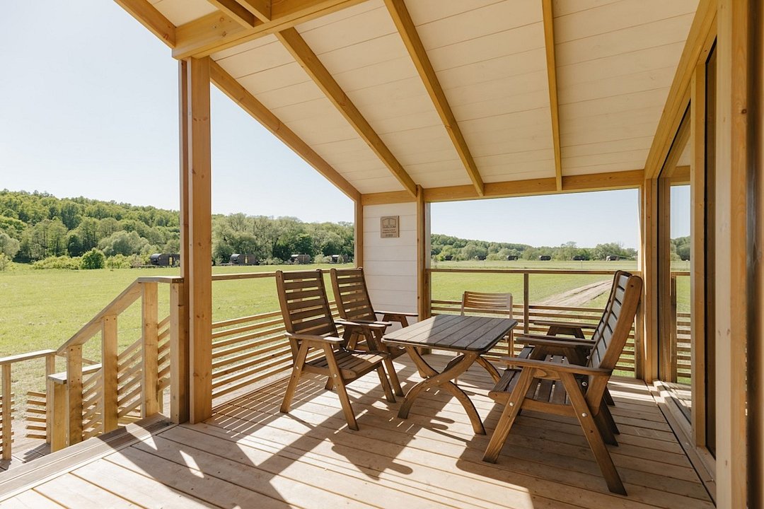 Инфраструктура: зона отдыха, душУютная баня на дровах с большими панорамными окнами спряталась среди сосен, откуда открывается живописный вид на поле и реку. Внутри расположены парилка, комната отдыха, душевая и санузел. Снаружи — открытая веранда, идеальная для отдыха на свежем воздухе.