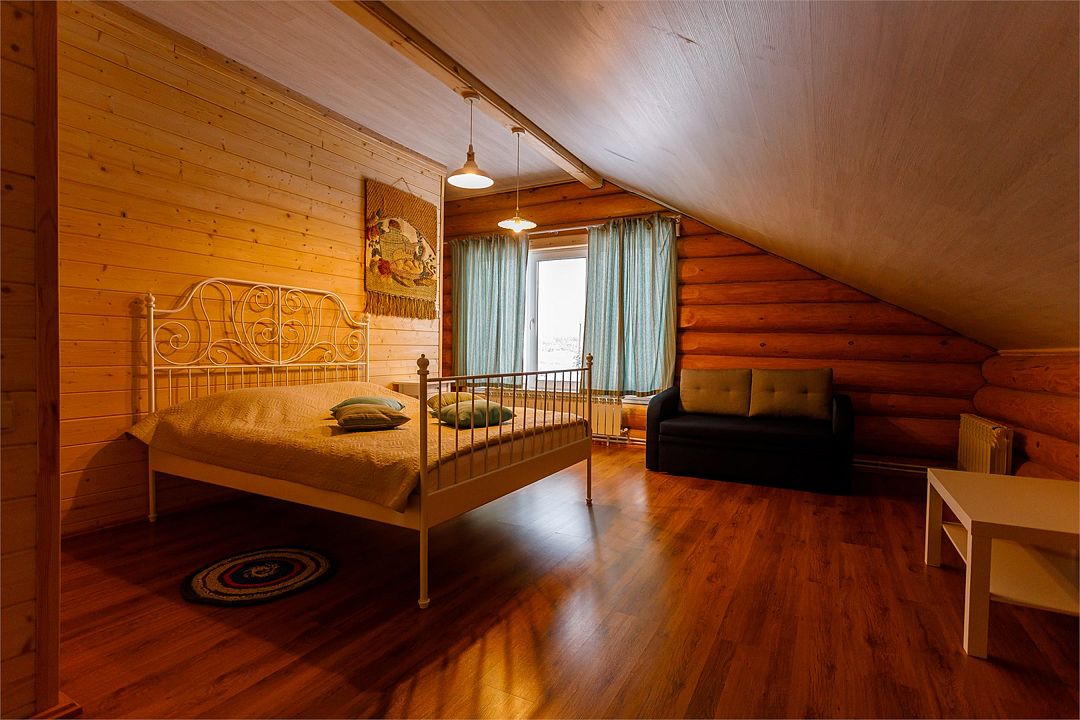 На втором этаже — одна большая комната с двуспальной кроватью и раскладным диваном, а также комната с балконом, в которой стоят 1,5-спальная кровать и раскладной диван. Для вашего удобства, ванные комнате есть и на первом, и на втором этажах.