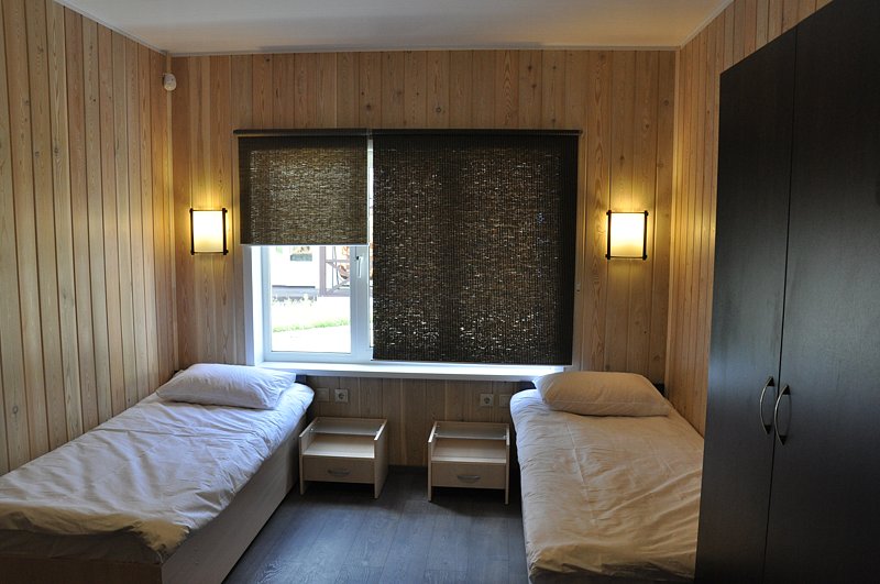 На первом этаже в каждом номере две односпальные кровати, телевизор, чайник. Удобства на два номера.
