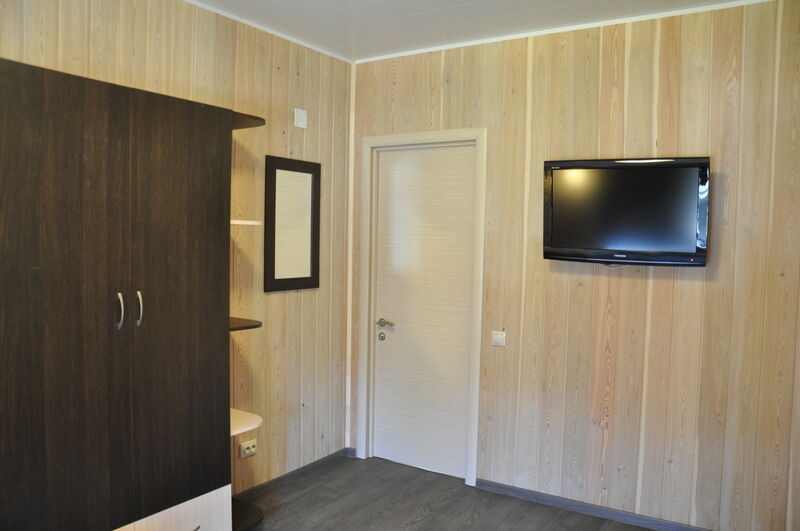 На втором этаже в каждом номере одна двуспальная кровать, телевизор, чайник. Удобства в номере.