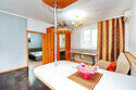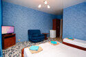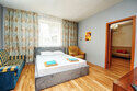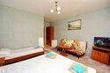 двуспальная кровать, кресло кровать, двуспальный диван, телевизор, сплит система, холодильник, тумбочки, душ и санузел в номере, фен.