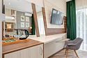 Двухэтажный корпус отеля занимает закрытую благоустроенную территорию площадью 2000 кв.м, гостей ожидают двухместные номера категории Стандарт и Семейный с видами на море или горы. Светлые номера с панорамными окнами оснащены кондиционером, ЖК-телевизором, холодильником, в каждом есть собственный санузел с душем. На территории отеля работает кафе, где отдыхающие могут заказать себе обед или ужин.
