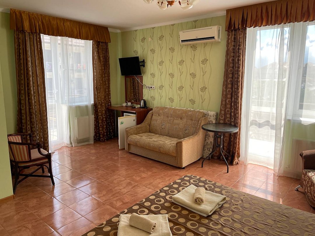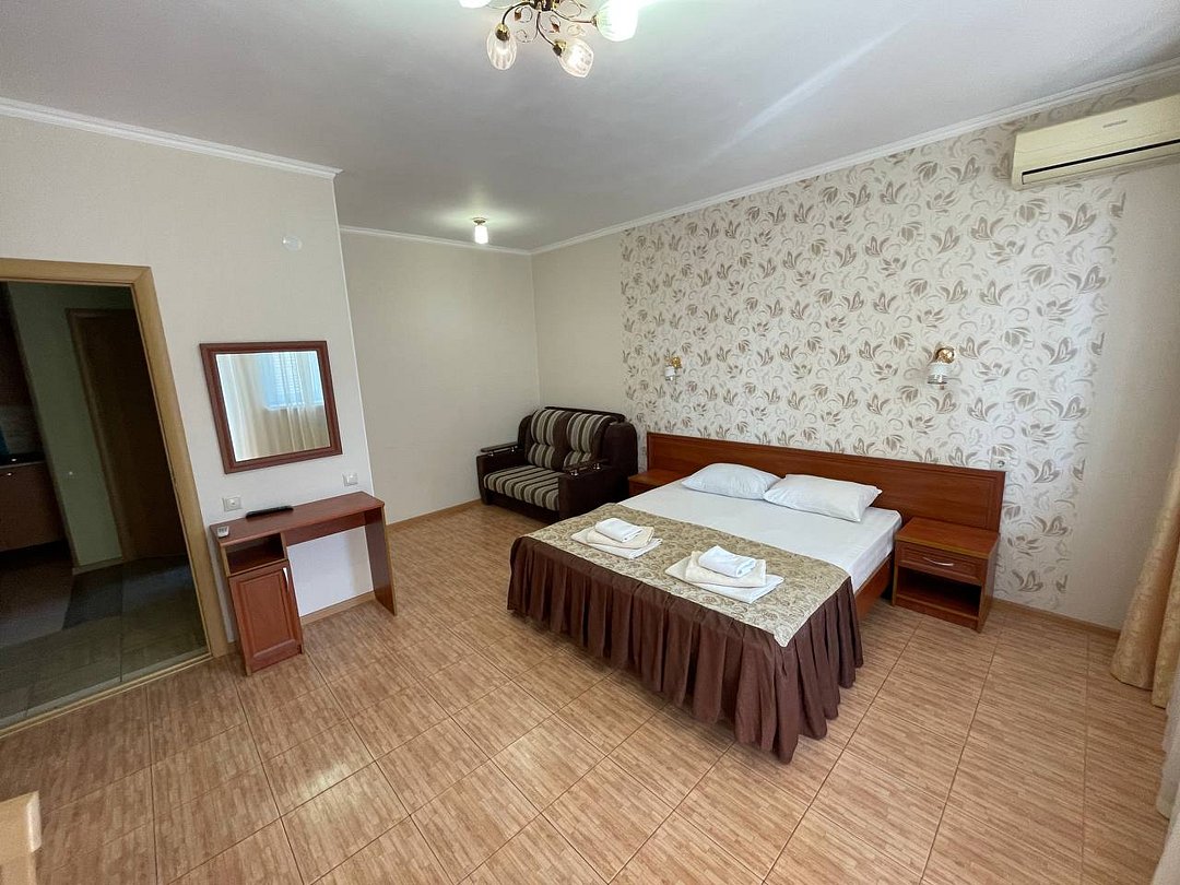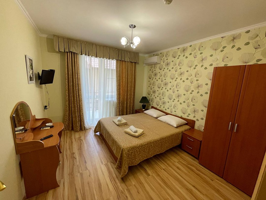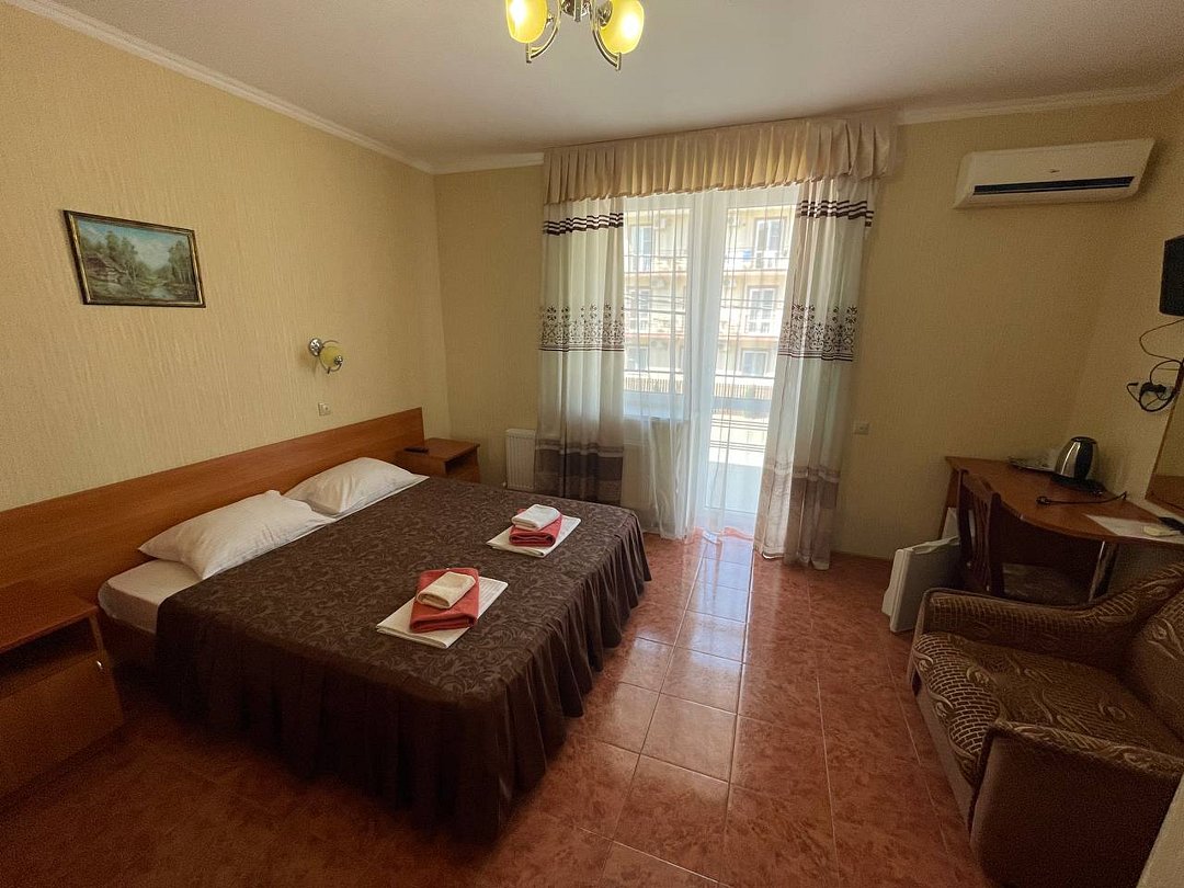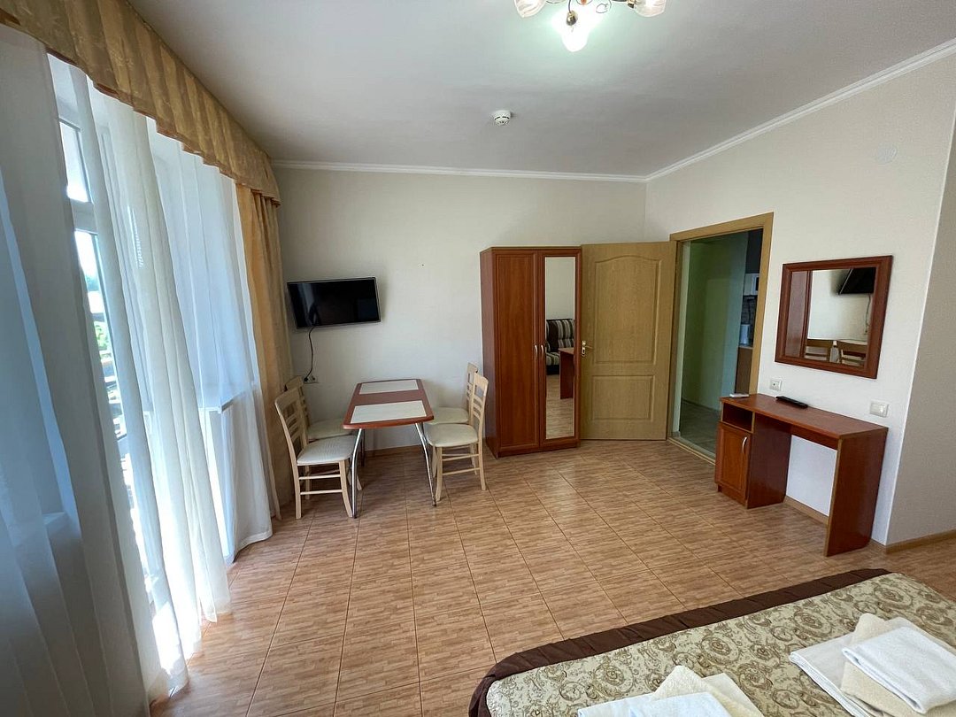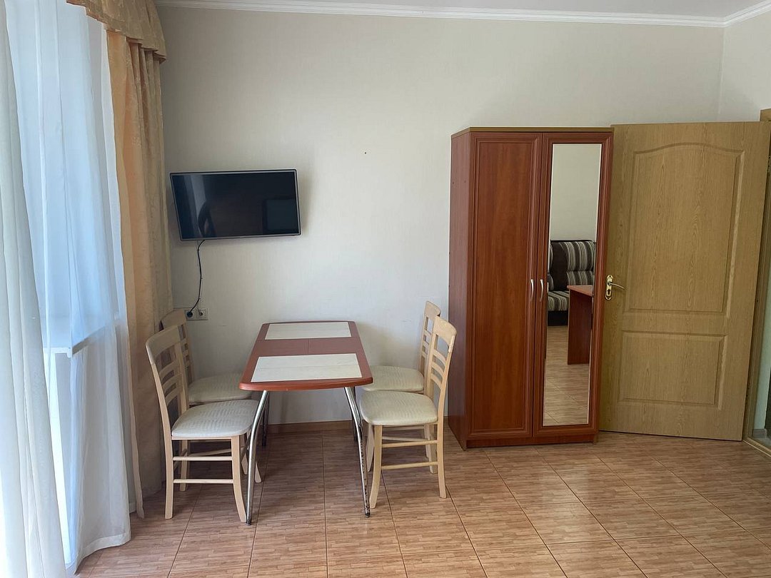 двуспальная кровать и односпальная, санузел, телевизор, мини-холодильник, сплит-система, балкон или терраса, чайник, чайные принадлежности, мебель на балконе. Есть 2х комнатный1-комнатный аппартамент с кухней №18