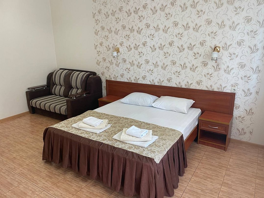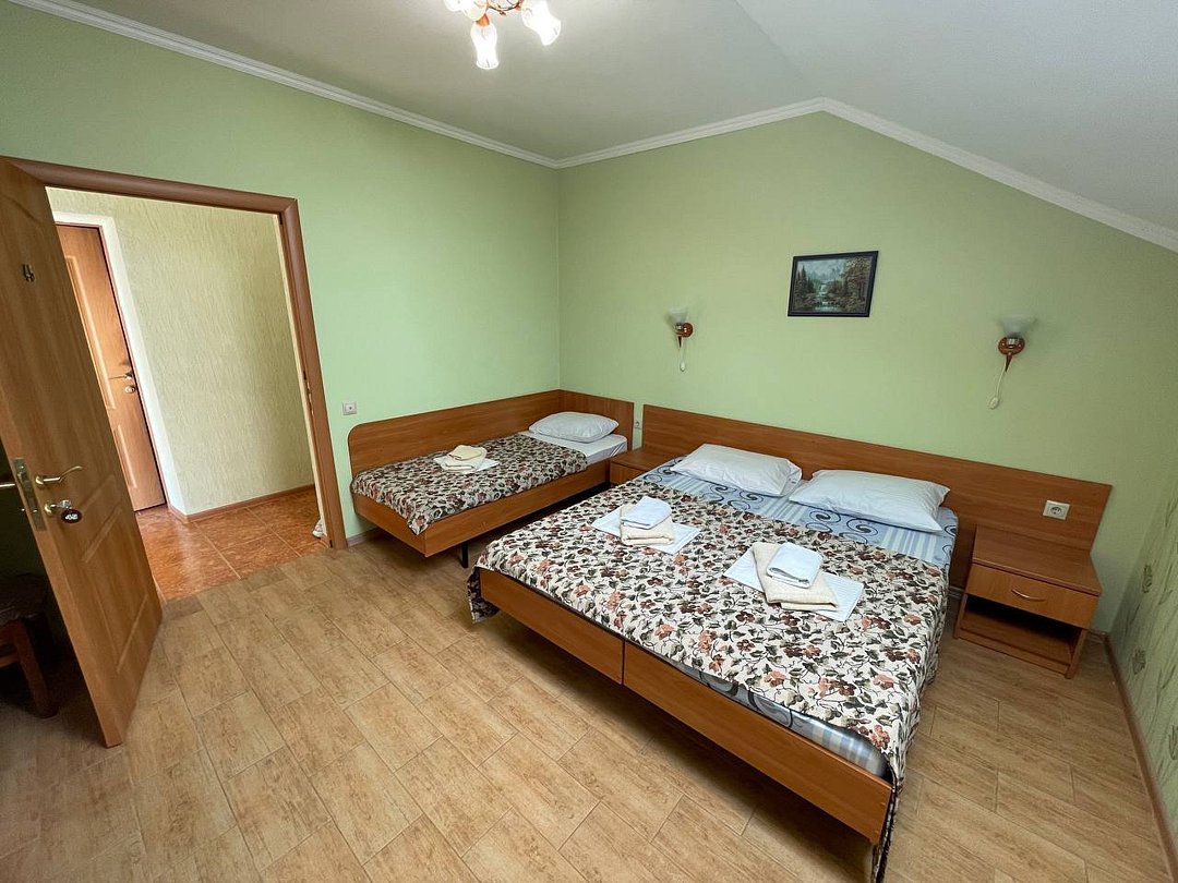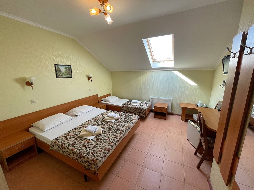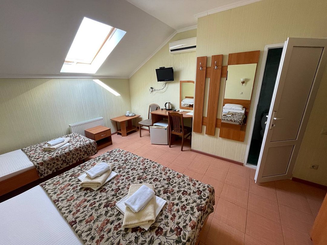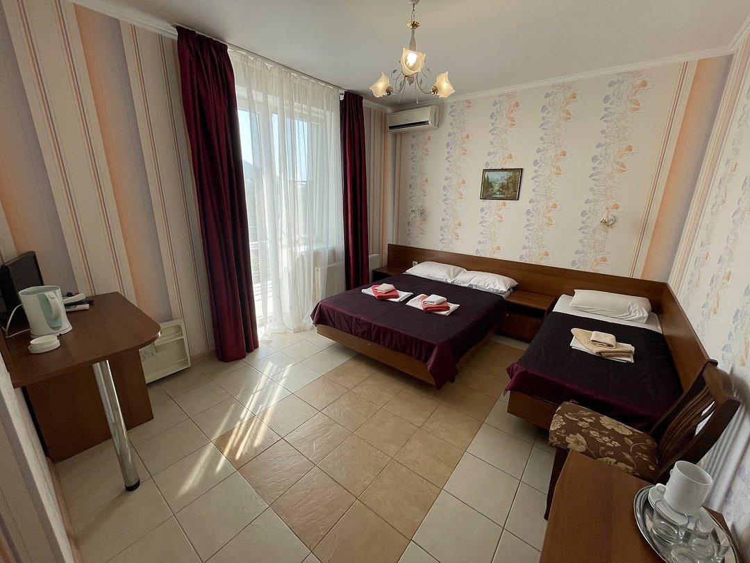 - три односпальные или одна двуспальная кровати, и одна односпальная кровать, санузел, телевизор, мини-холодильник, чайник, чайные принадлежности, сплит-система, без балкона.3-х мест.с балконом или террасой