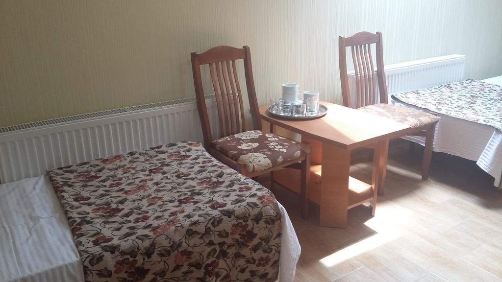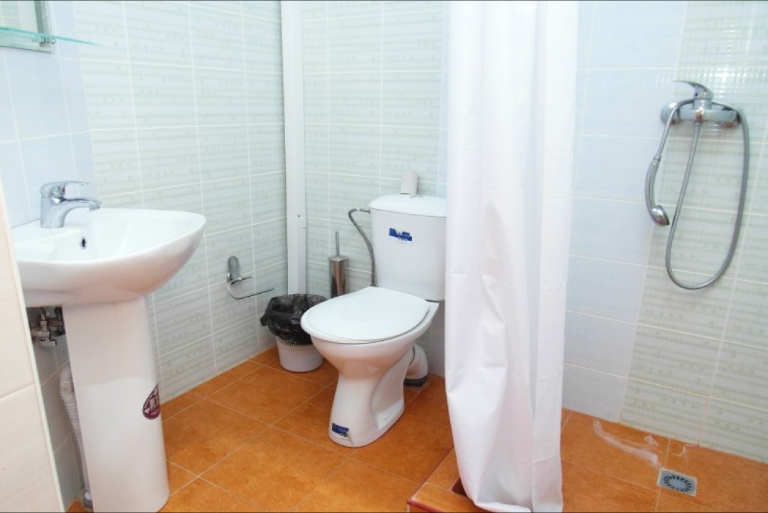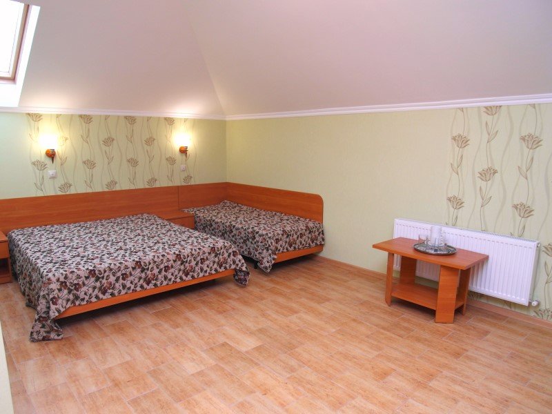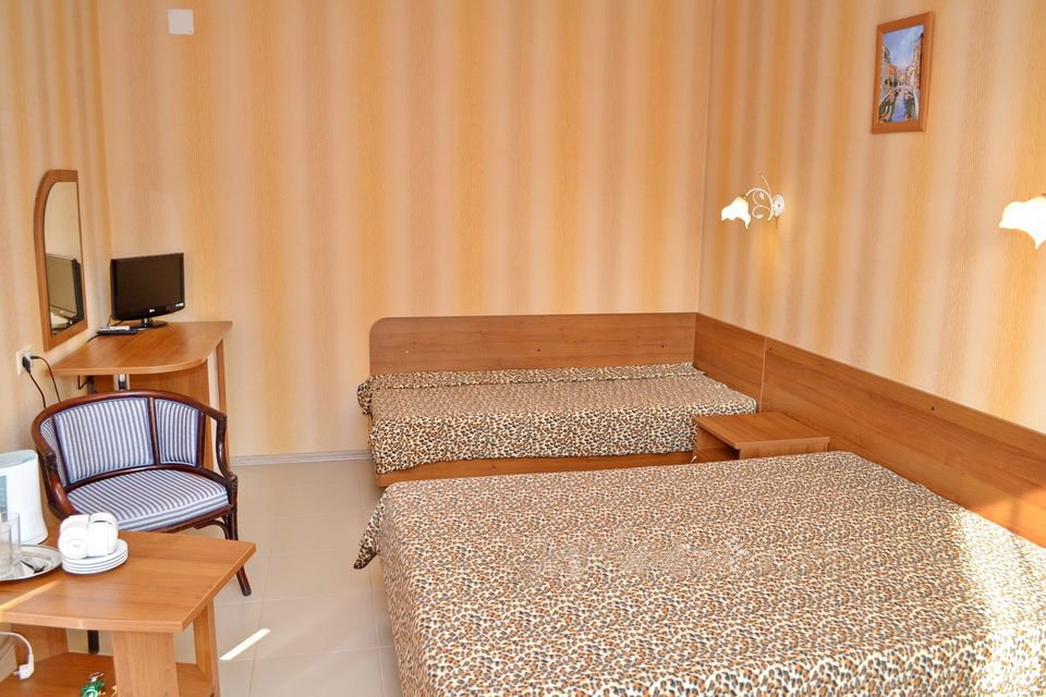 двуспальная и две односпальных кровати, или 4 раздельные кровати, санузел, ТВ, мини холодильник, чайник, чайные принадлежности, сплит система. Без балкона. Есть номера с ванной4-х местн. 2-х комнатный люкс с балконом