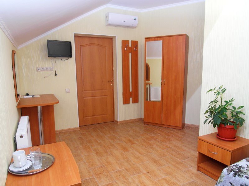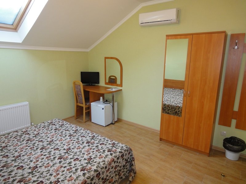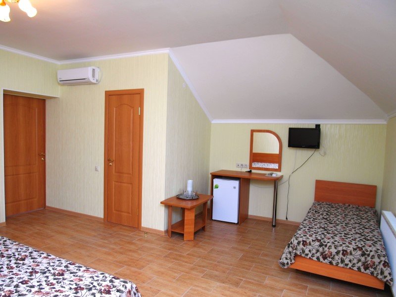 2 односпальные или одна двуспальная кровати, санузел, телевизор, мини-холодильник, сплит-система, чайник, чайные принадлежности,3-х мест. Мансарда удобства на блок