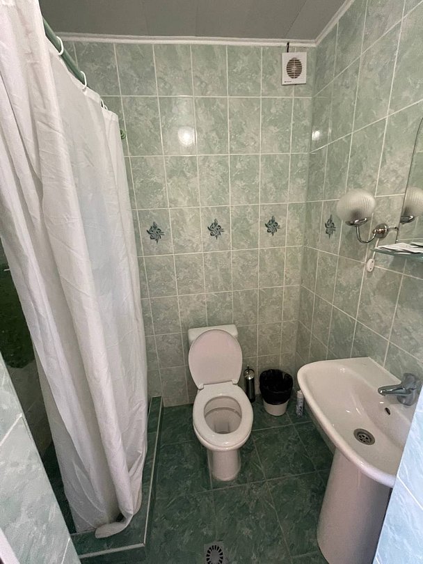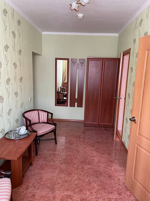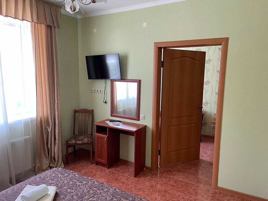 двуспальная и 2 односпальных кровати, санузел, ТВ, мини холодильник, 2 сплит системы, чайник, чайные принадлежности, вход с террасы2х комнатнай полулюкс без балкона 4х мест