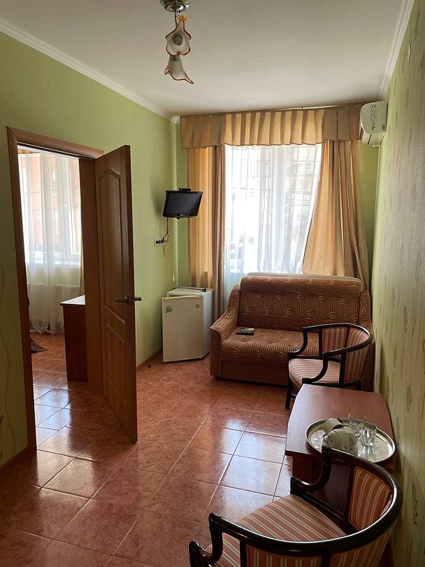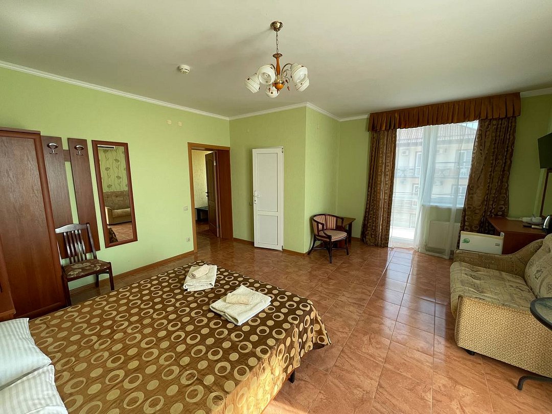 двуспальная кровать+диван, санузел с ванной, 2 ТВ, мини холодильник, 2 сплит системы, чайник, чайные принадлежности, без балкона.Или нужно забронировать сразу несколько номеров? Вы можете оставить письменную заявку и мы поможем составить бронирование на основе Ваших особых пожеланий.