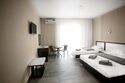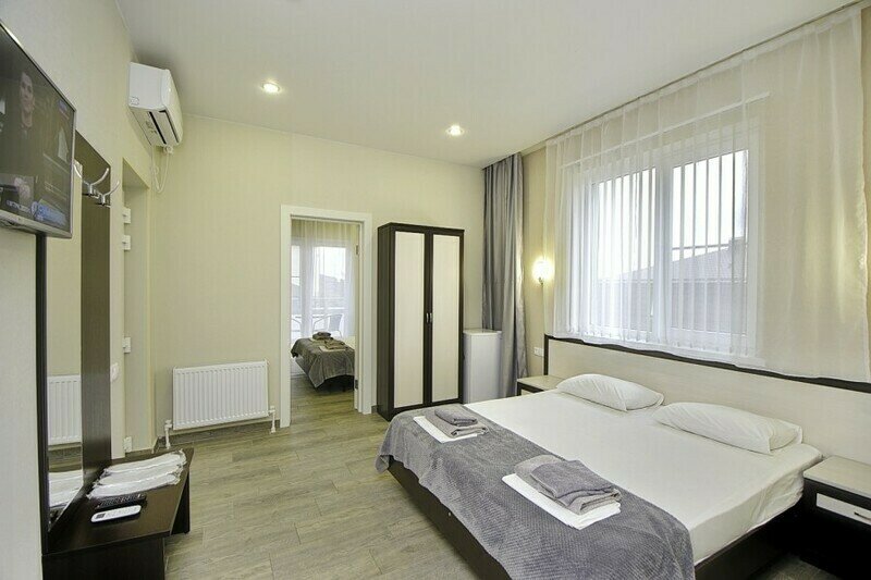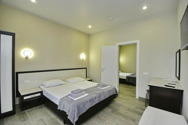 В номере двуспальная кровать и две односпальные кровати, душ, туалет, сплит система и телевизор в каждой комнате, холодильник, стол и стулья, зеркало , прикроватные тумбочки, шкаф.