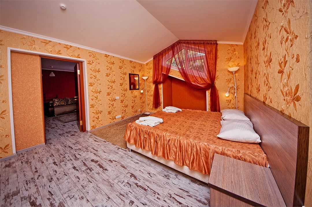 Дизайн отделки номеров может отличаться от указанного на фото. Делюксы с одной спальней и гостиной, в которых могут разместиться до 4 человек. Спальня состоит из двух односпальных кроватей (соединяются в двуспальную кровать топпером), диваном-кроватью, зоны «Рабочее место» с рабочей поверхностью и удобными креслами идеально подходящими для мобильной работы. В гостиной зоне с достаточным количеством сидячих мест в течение дня, которые раскладываются в спальное место, есть телевизор. В коридоре просторный встроенный шкаф. В комнате мини-холодильник, сплит-система, в ванной комнате установлен душ, также мы предоставляем утюг и гладильную доску на этаже. Полотенца меняют каждые 3-4 дня, а постельное белье - еженедельно. Уборка осуществляется ежедневно (с 08:00 до 15:00). Номера расположены в 6 корпусе. Все номера с балконами.Услуги и удобства
