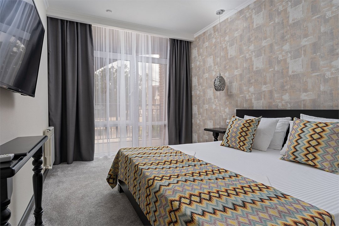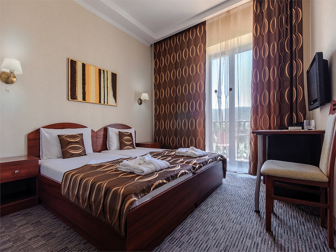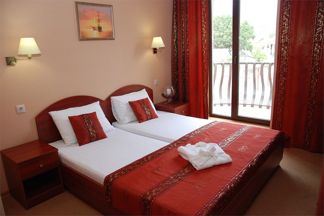 Одна комната. В номере: - большая французская кровать, - или две раздельные кровати, (Уточнять у администратора) - автономная система кондиционирования, - телефон, спутниковое ТВ, интернет, - мини-сейф, - фен, халат, тапочки, - средства индивидуальной гигиены, - санузел-ванная, - балкон или витражи ( вид с балкона может меняться) ПЕРЕЧЕНЬ УСЛУГ, ВХОДЯЩИХ В СТОИМОСТЬ: проживание, завтрак, открытый бассейн.Услуги и удобства