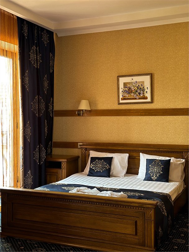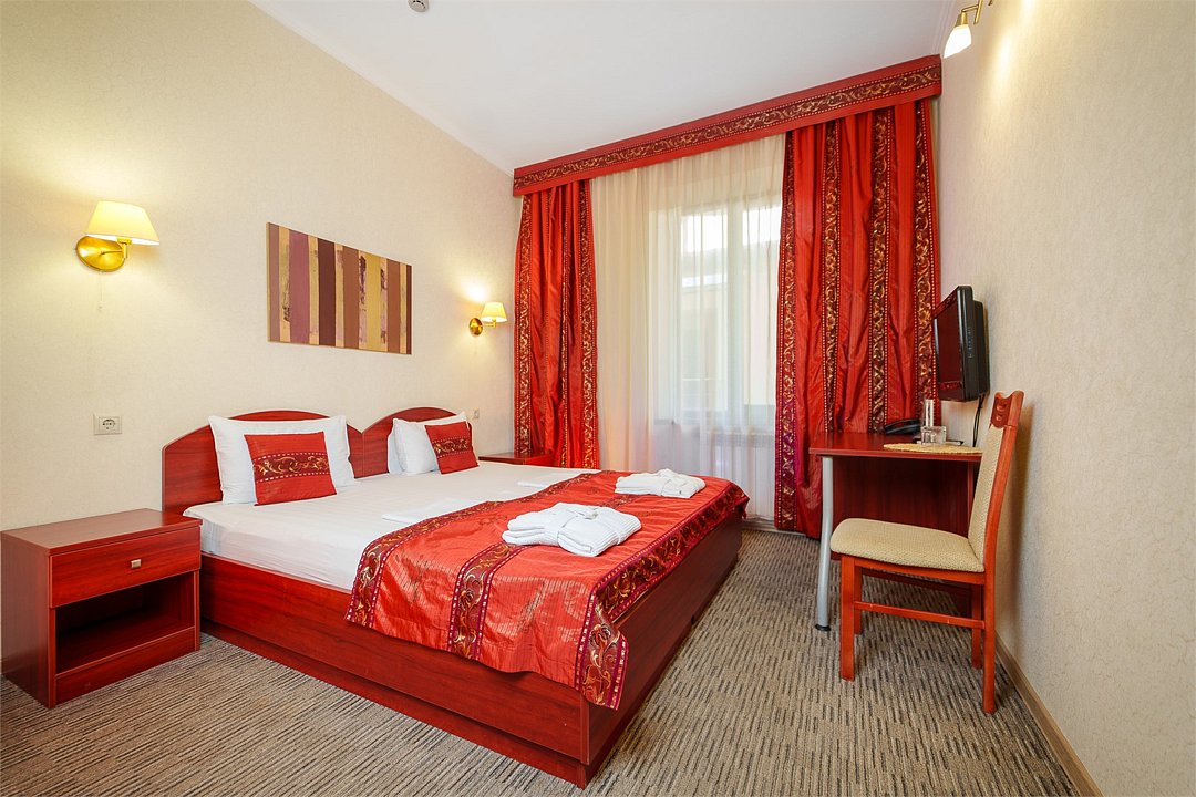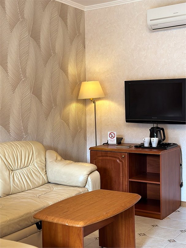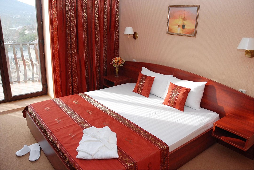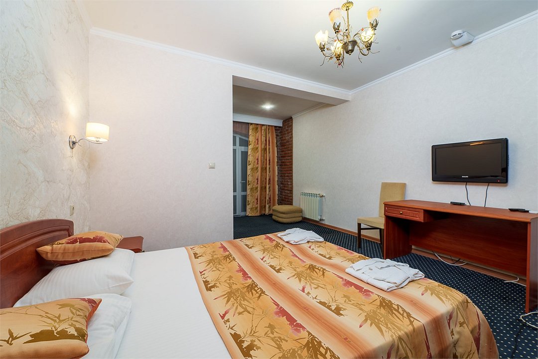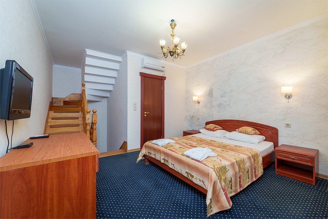 Общая площадь 34 кв.м. Просторный однокомнатный номер с итальянской дубовой мебелью. В номере: - большая кровать, - гостиная с мягкой мебелью, - автономная система кондиционирования, - телефон, спутниковое ТВ, интернет, - мини-сейф, - фен, халат, тапочки, - средства индивидуальной гигиены, - санузел-ванная, - витражи ПЕРЕЧЕНЬ УСЛУГ, ВХОДЯЩИХ В СТОИМОСТЬ: проживание, завтрак, открытый бассейн.Услуги и удобства