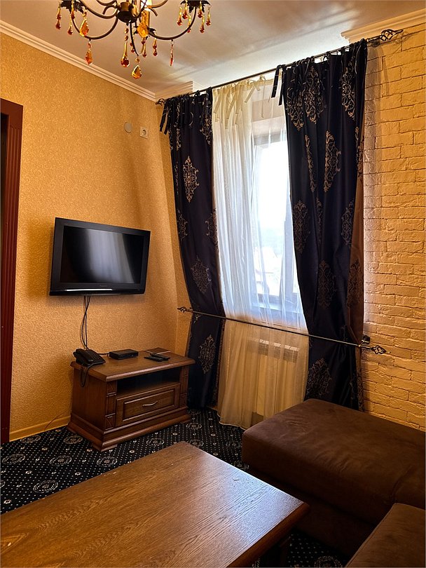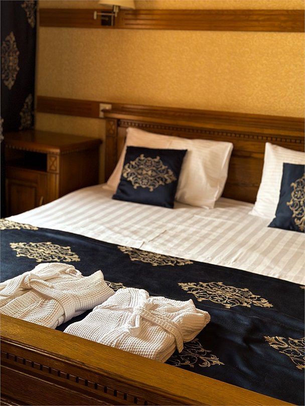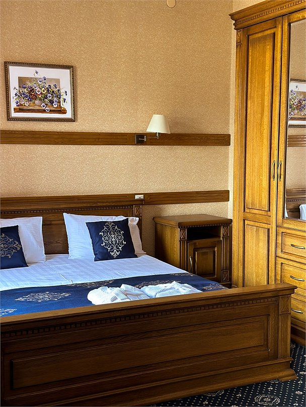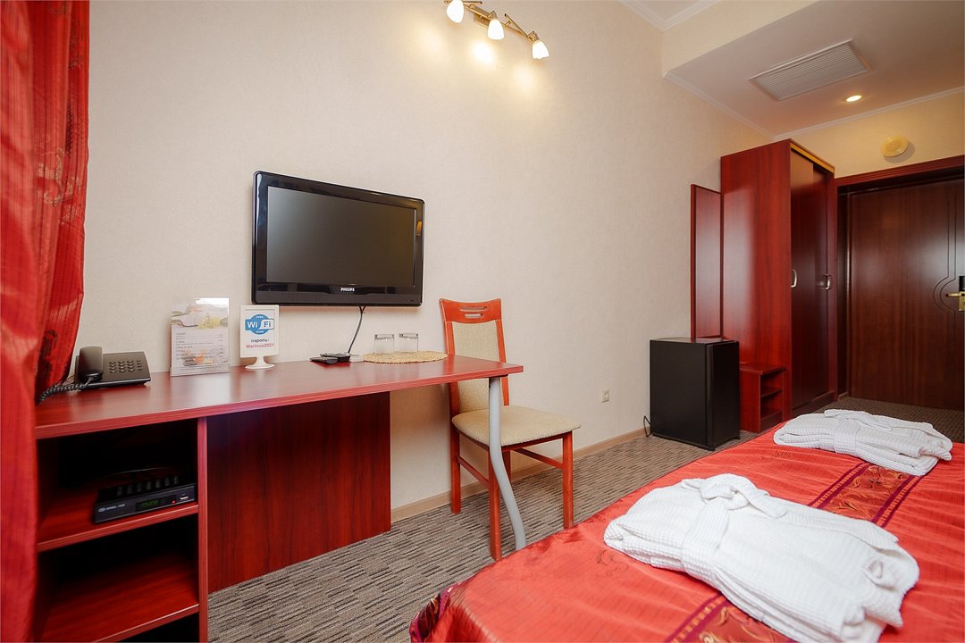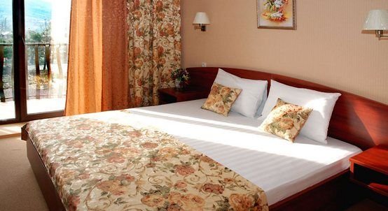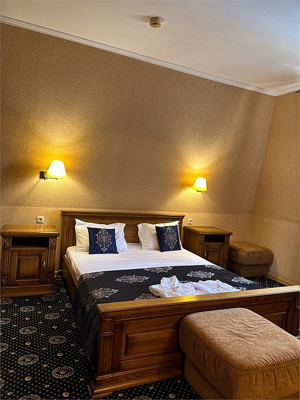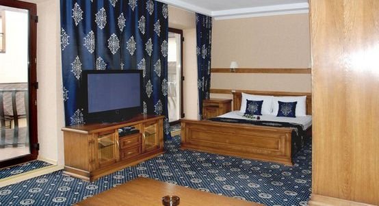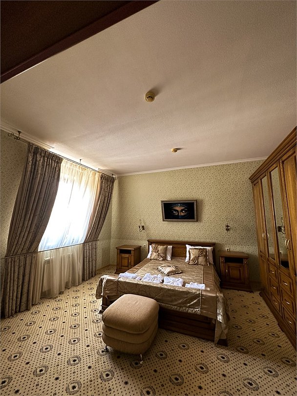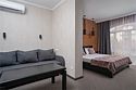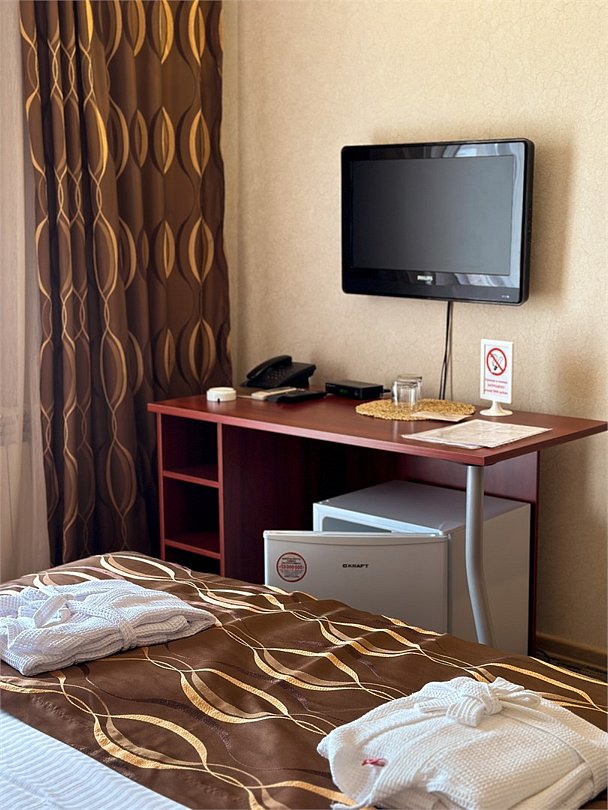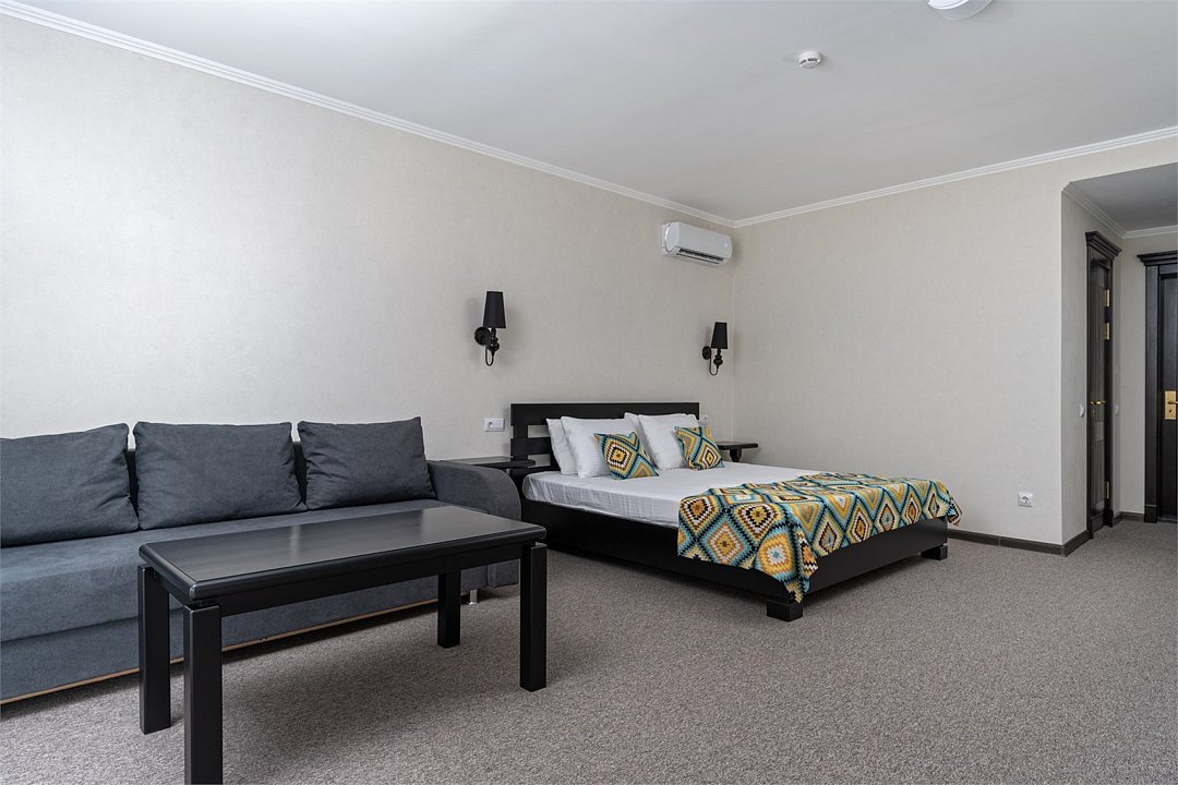 Общая площадь 34 кв.м. Просторный однокомнатный номер с итальянской дубовой мебелью. В номере: - большая кровать, - гостиная с мягкой мебелью, - автономная система кондиционирования, - телефон, спутниковое ТВ, интернет, - мини-сейф, - фен, халат, тапочки, - средства индивидуальной гигиены, - санузел-ванная, - витражи ПЕРЕЧЕНЬ УСЛУГ, ВХОДЯЩИХ В СТОИМОСТЬ: проживание, завтрак, открытый бассейн.Услуги и удобства