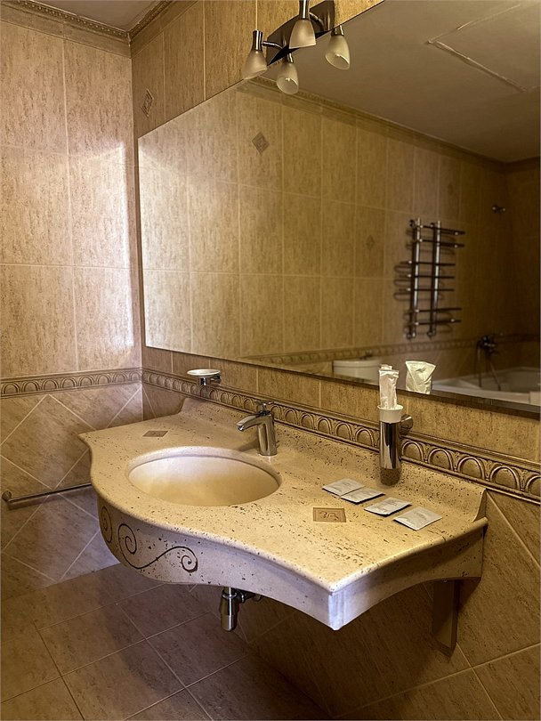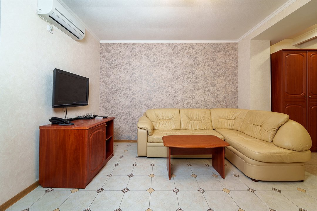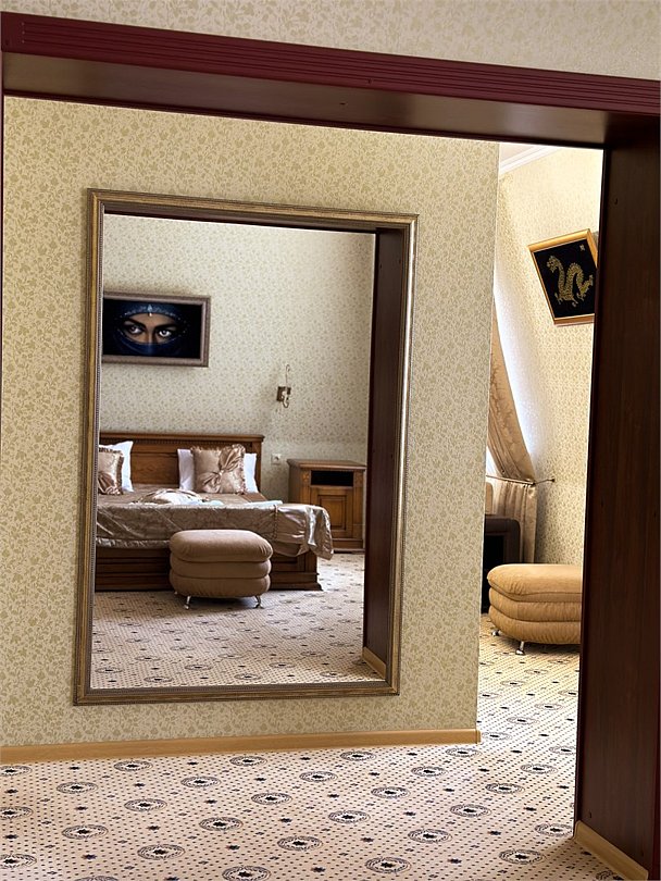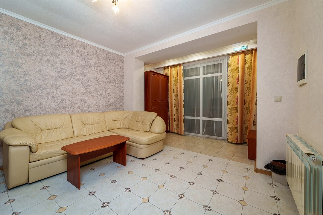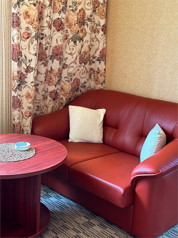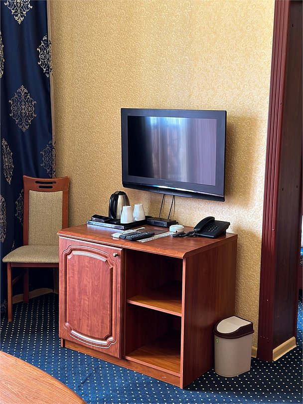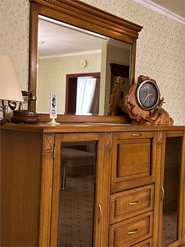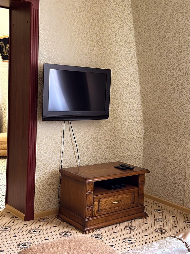 Общая площадь 34 кв.м. Просторный однокомнатный номер с итальянской дубовой мебелью. В номере: - большая кровать, - гостиная с мягкой мебелью, - автономная система кондиционирования, - телефон, спутниковое ТВ, интернет, - мини-сейф, - фен, халат, тапочки, - средства индивидуальной гигиены, - санузел-ванная, - витражи ПЕРЕЧЕНЬ УСЛУГ, ВХОДЯЩИХ В СТОИМОСТЬ: проживание, завтрак, открытый бассейн.Услуги и удобства