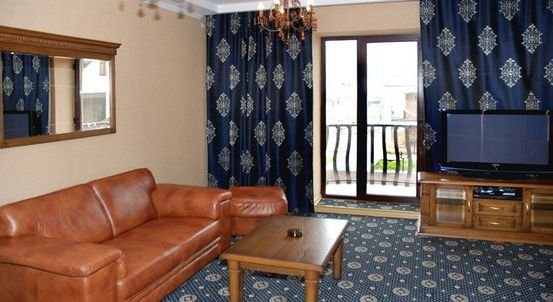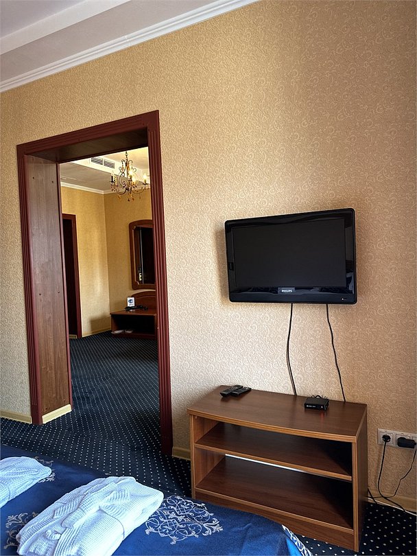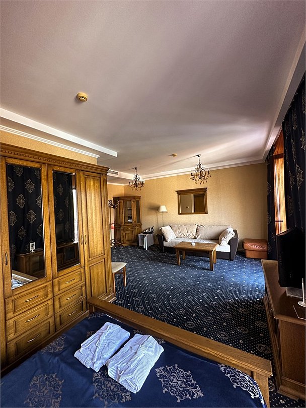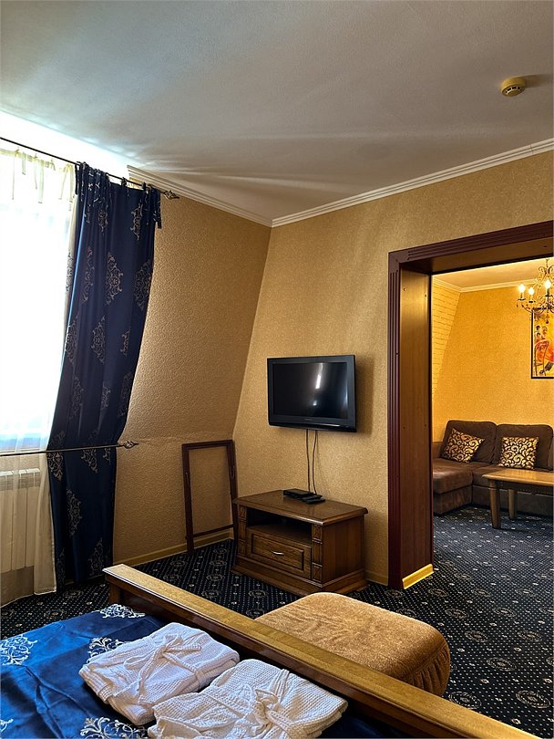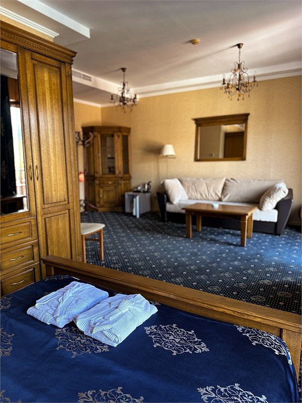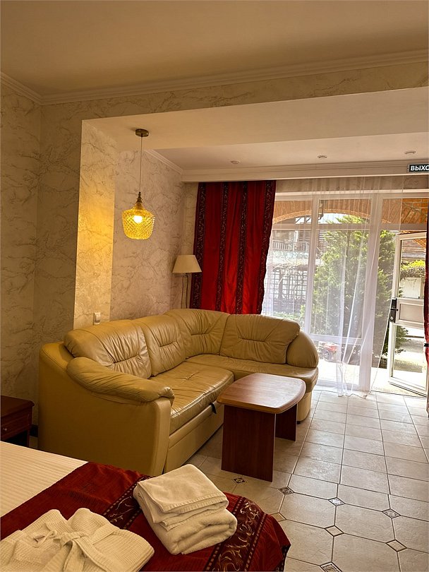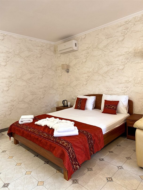 Общая площадь 36 кв.м. Две комнаты с итальянской дубовой мебелью. В номере: - спальня с большой кроватью, - гостиная с раскладным диваном, - автономная система кондиционирования, - телефон, спутниковое ТВ, интернет, - мини-сейф, - фен, халат, тапочки, - средства индивидуальной гигиены, - санузел-ванная, - нет балкона - нет межкомнатной двери ПЕРЕЧЕНЬ УСЛУГ, ВХОДЯЩИХ В СТОИМОСТЬ: проживание, завтрак, открытый бассейн в летний сезонУслуги и удобства