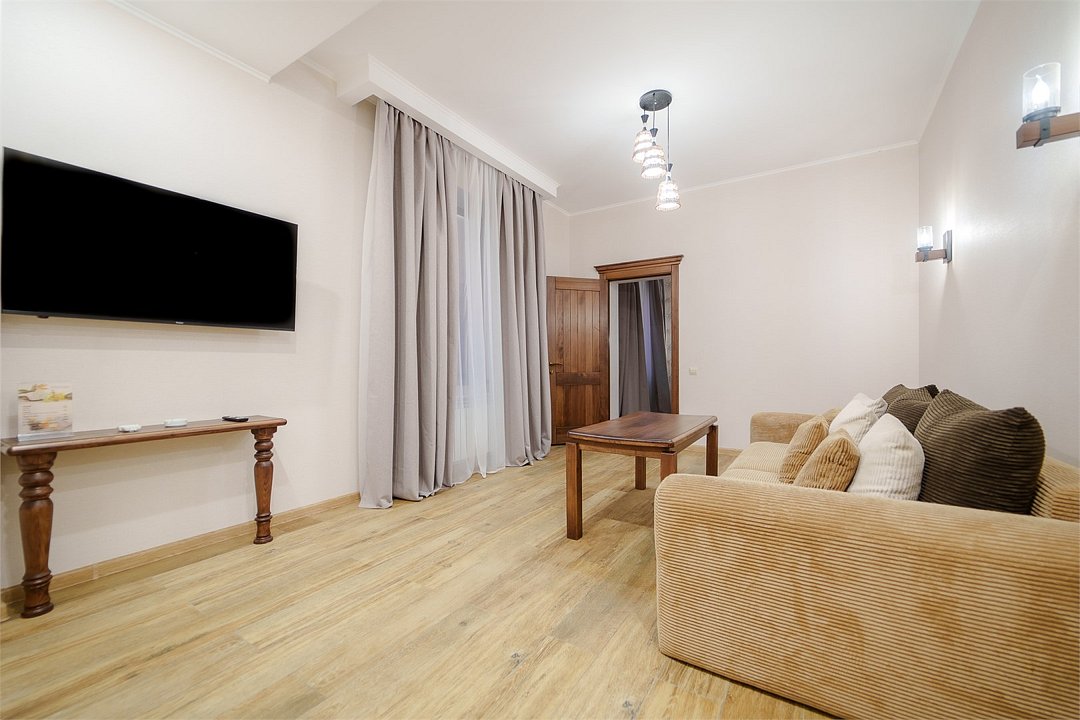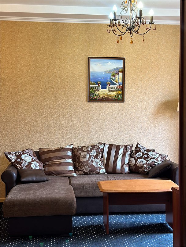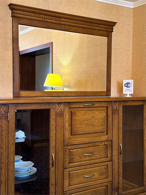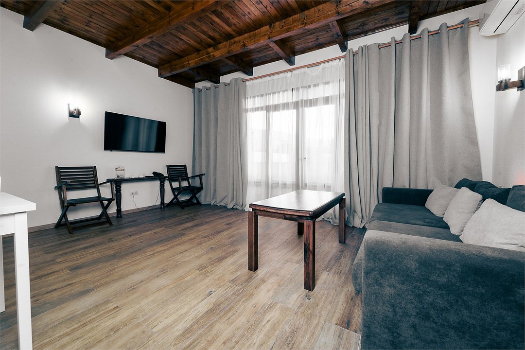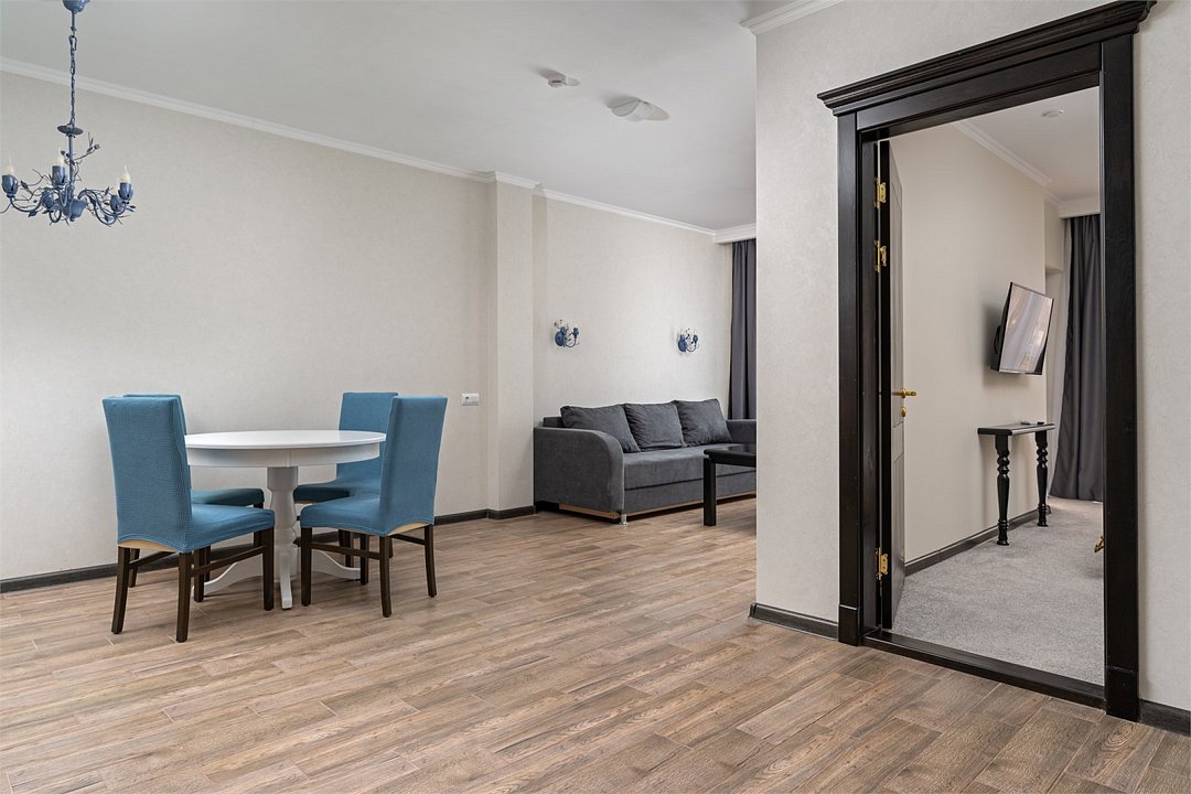 Общая площадь 36 кв.м. Две комнаты с итальянской дубовой мебелью. В номере: - спальня с большой кроватью, - гостиная с раскладным диваном, - автономная система кондиционирования, - телефон, спутниковое ТВ, интернет, - мини-сейф, - фен, халат, тапочки, - средства индивидуальной гигиены, - санузел-ванная, - нет балкона - нет межкомнатной двери ПЕРЕЧЕНЬ УСЛУГ, ВХОДЯЩИХ В СТОИМОСТЬ: проживание, завтрак, открытый бассейн в летний сезонУслуги и удобства