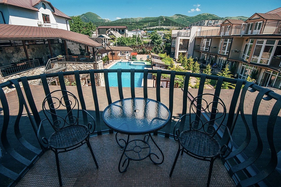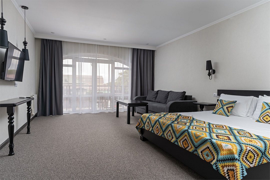 Общая площадь 25 кв.м. В номере: - спальня с французской кроватью, - зона отдыха с раскладным диваном, - автономная система кондиционирования, - телефон, спутниковое ТВ, интернет, - мини-сейф, - фен, халат, тапочки, - средства индивидуальной гигиены, - санузел-ванная, - балкон ( вид с балкона может отличаться) ПЕРЕЧЕНЬ УСЛУГ, ВХОДЯЩИХ В СТОИМОСТЬ: проживание, завтрак, открытый бассейн.Услуги и удобства