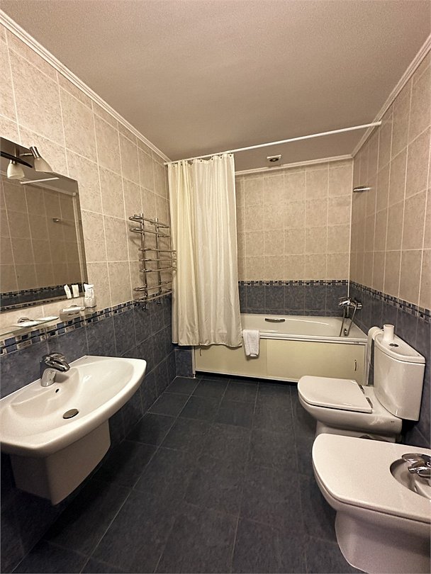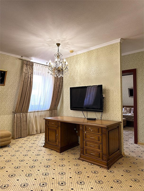 два телевизора, Wi-Fi, холодильник, светильник, фен, электронные замки, плита для приготовления пищи, микроволновая печь, ванна, халаты, банные полотенца, тапочки, гигиенические средства, двуспальная кровать, стулья, шкаф для одежды, журнальный столик, письменный стол, обеденный стол, багажная тумба, зеркало, комод, кухня, набор посуды, сейф, чайник, раковина, мягкая мебель, обеденная зона, гостиная зона, ковровое покрытие, отопление, вид на город, кухонная посуда, стаканы, кухонная утварь, столовые приборы, стул, туалетные средства, туалет, сплит-система, сушилка для белья, цифровое тв, диван-кровать, раскладной диван, внутренний телефон, телевизор с плоским экраном, кухонный уголок, гостиничная парфюмерия, уборка номера, без питомцевВ гостиничном номере