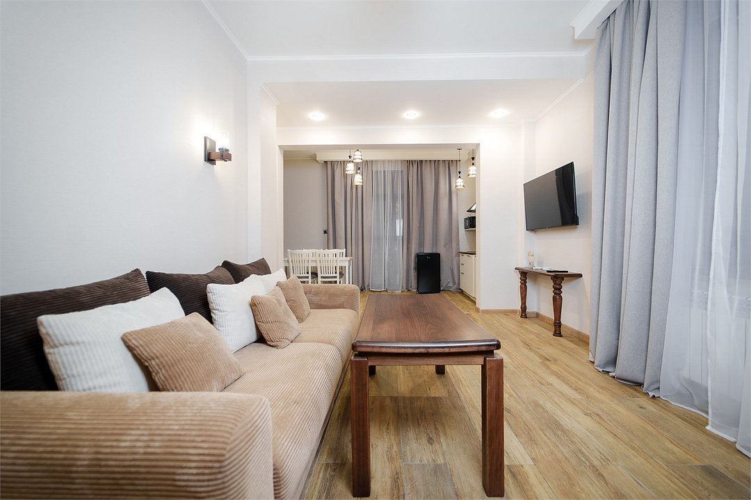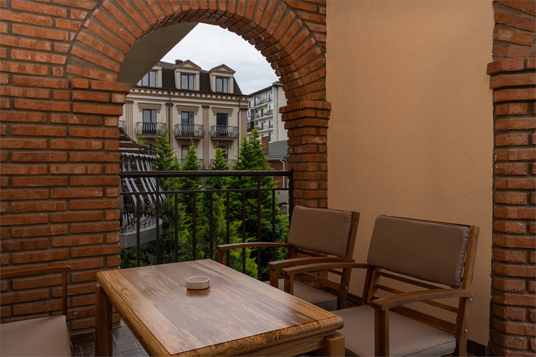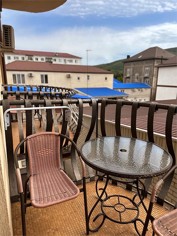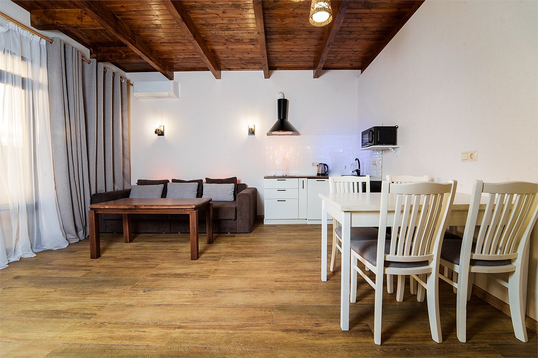 Номер сделан в виде небольшой квартиры. В номере 2 основных места и 3 дополнительных. Кухня оснащена всей необходимой техникой и посудой. Зона гостиной с двуспальным раскладным диваном и креслом . Балкон с мебелью.Услуги и удобства
