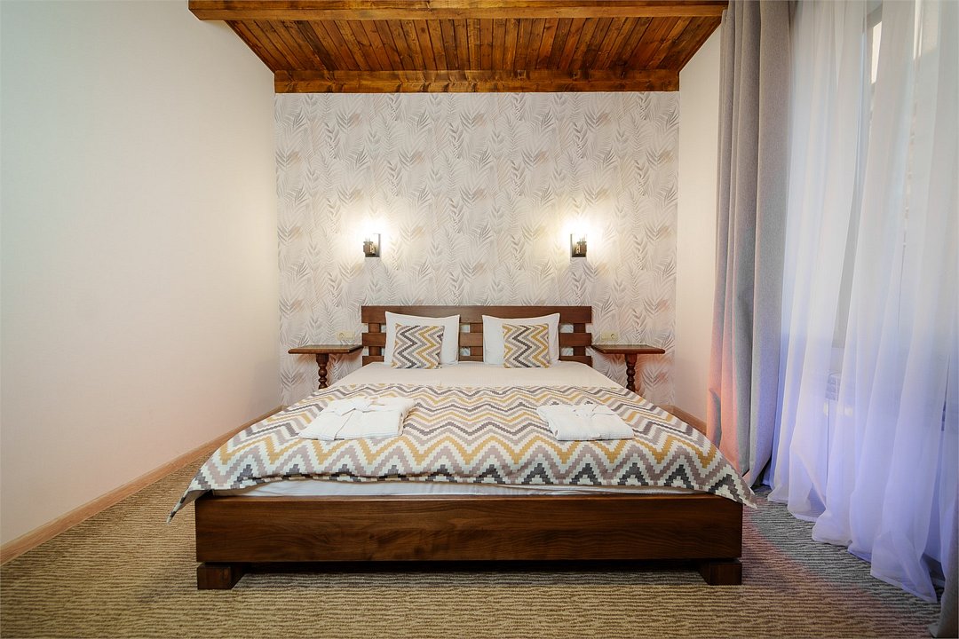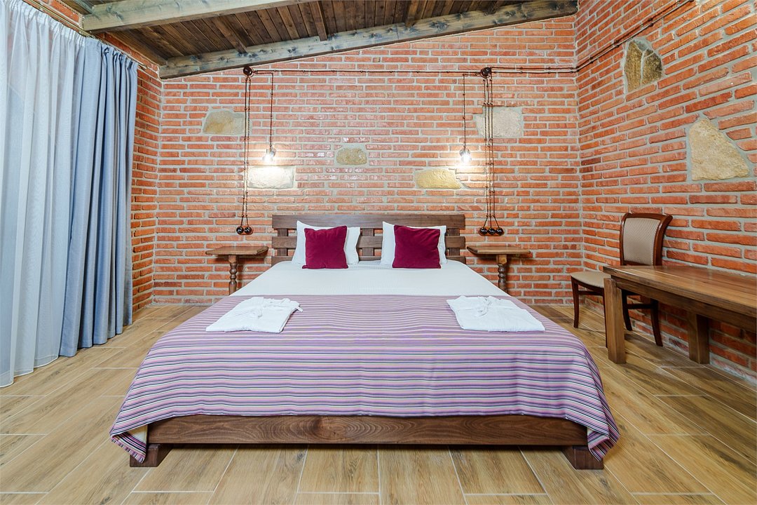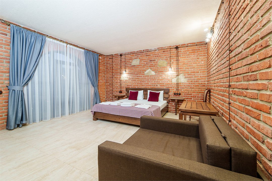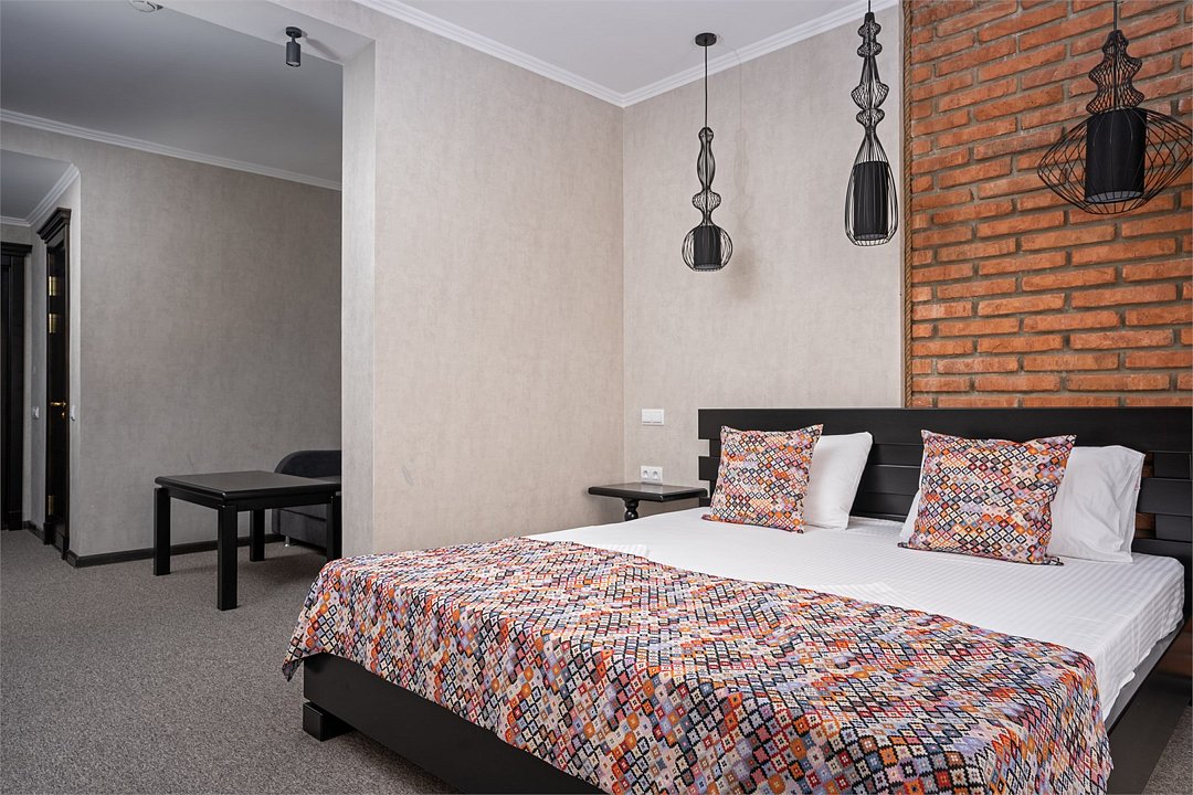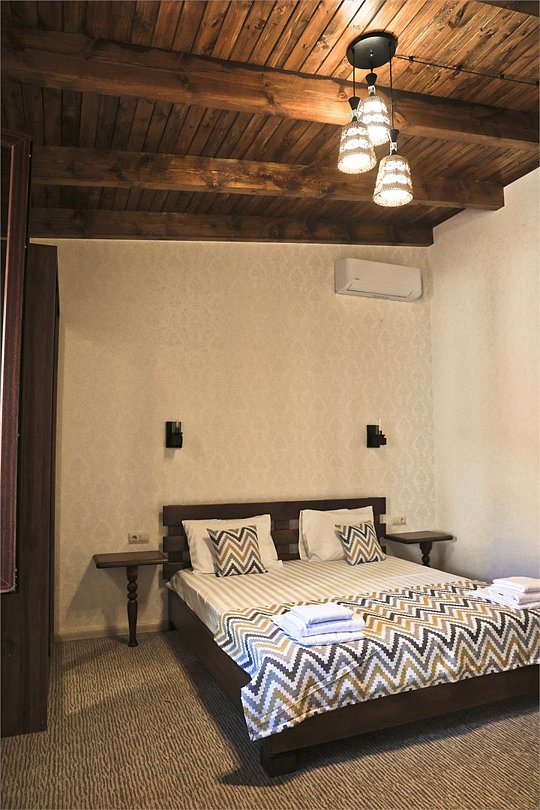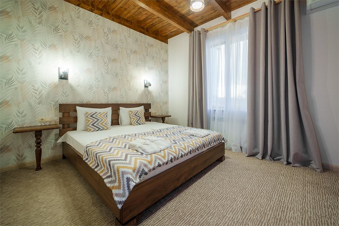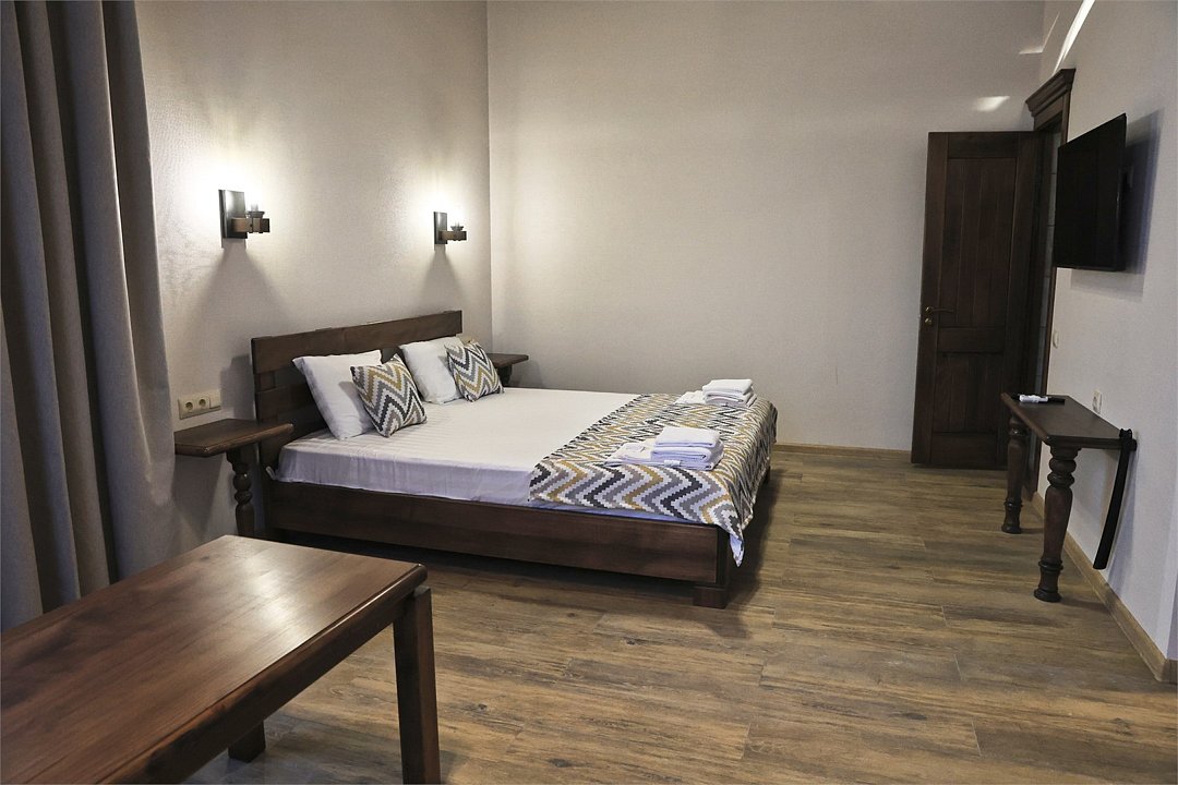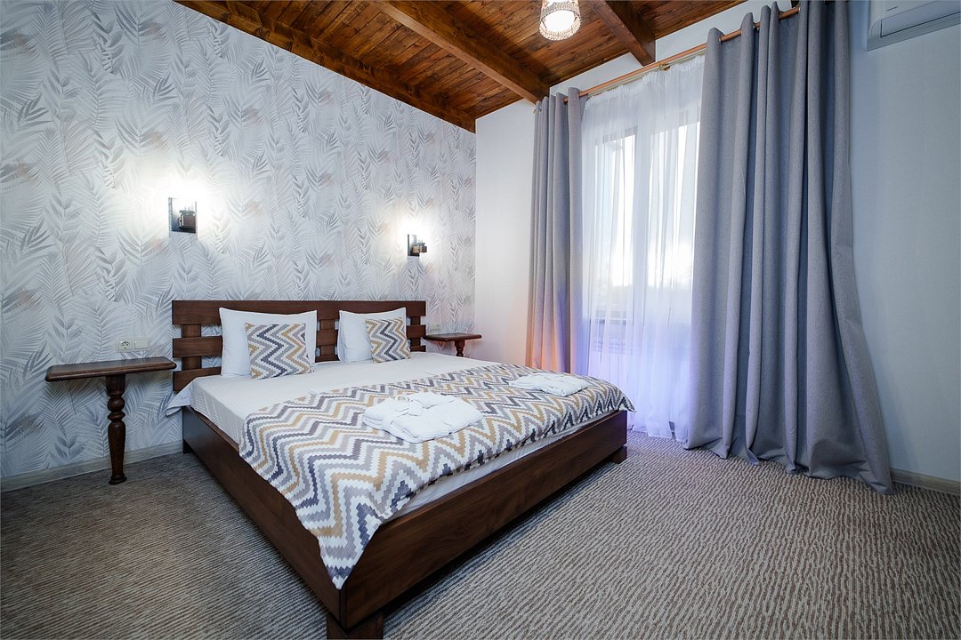 Общая площадь 30 кв.м. Просторный однокомнатный номер . ( 1 и 2 этаж) В номере: - большая кровать, - гостиная с мягкой мебелью, - автономная система кондиционирования, - телефон, спутниковое ТВ, интернет, - мини-сейф, - фен, халат, тапочки, - средства индивидуальной гигиены, - санузел-ванная или душевая - витражи ПЕРЕЧЕНЬ УСЛУГ, ВХОДЯЩИХ В СТОИМОСТЬ: проживание, завтрак, открытый бассейн.Услуги и удобства