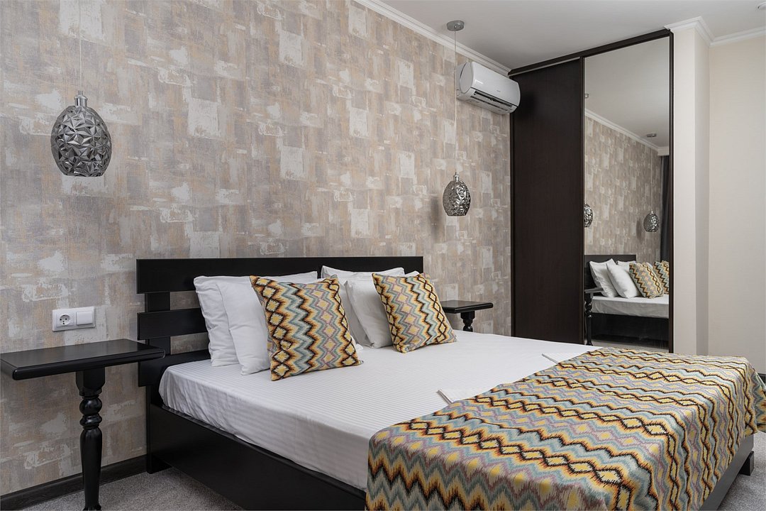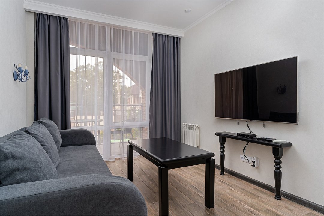 Общая площадь 36 кв.м. Просторный двухкомнатный номер в современном стиле В номере: - большая кровать, - раскладное кресло и раскладной диван или две доп кровати - автономная система кондиционирования, - телефон, смарт ТВ, интернет, - мини-сейф, - фен, халат, тапочки, - средства индивидуальной гигиены, - санузел-душевая, - гостевая мангальная зона - красивый внутренний дворик с лавочками и пальмами - бесплатный мангал с гостевой зоной отдыха - Внимание гостей, спальные места второй комнаты могут отличаться ПЕРЕЧЕНЬ УСЛУГ, ВХОДЯЩИХ В СТОИМОСТЬ: проживание, завтрак, открытый бассейн.Услуги и удобства