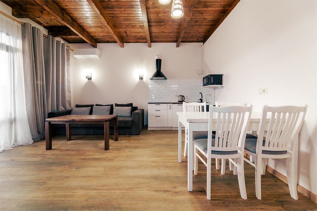 Номер сделан в виде небольшой квартиры. В номере 2 основных места и 3 дополнительных. Два сан узла, в обеих комнатах кондиционеры и тв . Кухня оснащена всей необходимой техникой и посудой. Зона гостиной с раскладным диваном и раскладное кресло , отдельный внутренний дворик с мангальной зоной для гостейУслуги и удобства