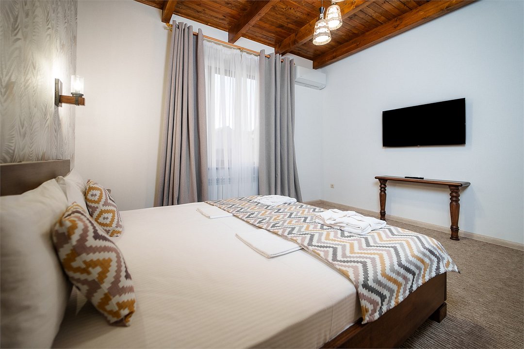 1 комната с большой французской кроватью или двумя раздельными, автономная система кондиционирования, телевизор, телефон, мини-холодильник, WIFI, фен, тапочки, средства индивидуальной гигиены.Услуги и удобства
