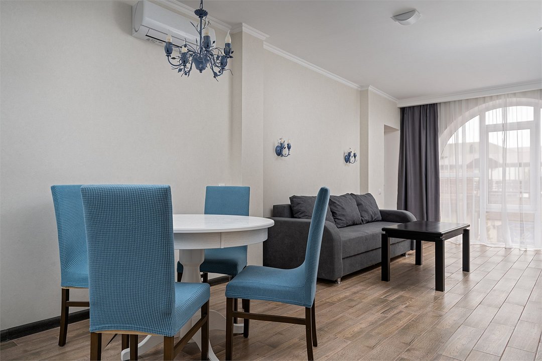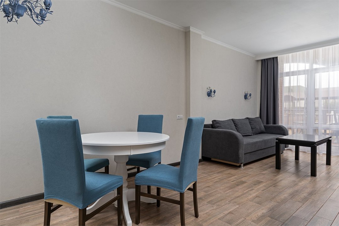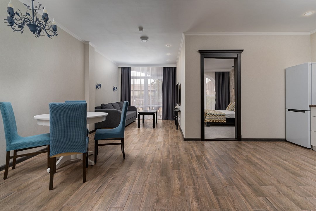 Номер сделан в виде квартиры. вместимость до 6 человек В номере 2 раздельные спальни и 2 дополнительных спальных места. Кухня оснащена всей необходимой техникой и посудой. Зона гостиной с двуспальным раскладным диваном . С каждой комнаты выход на балкон с видом на бассейн.Услуги и удобства