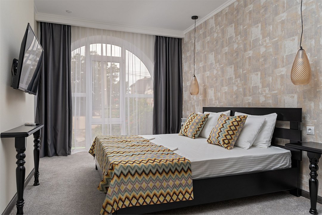 Отель расположен на собственной закрытой территории, площадью 0,18 га. Здание отеля построено в европейском стиле и совмещает современную архитектуру с элегантными интерьерами. Светлые и просторные номера оформлены в классическом стиле, обставлены деревянной мебелью и украшены роскошными тканями и изысканными цветочными композициями. Для размещения гостей предлагаются номера категорий Стандарт, Полулюкс, Люкс, Студия, Люкс Премиум, Семейный, 2-х этажный коттедж.
