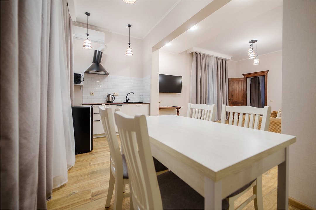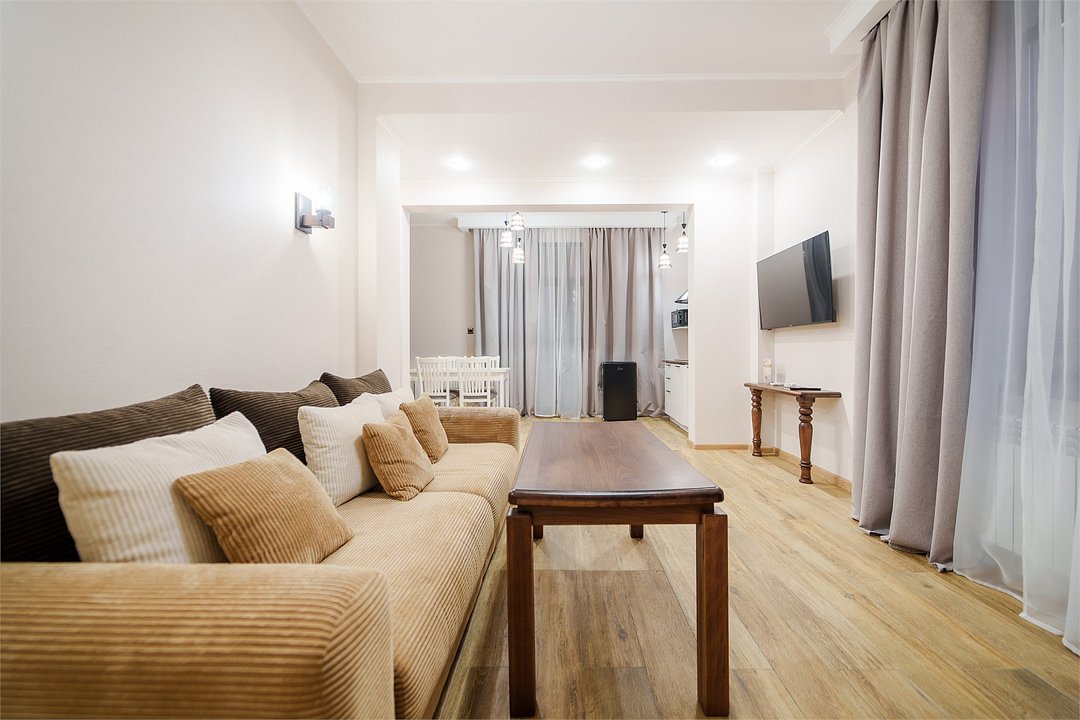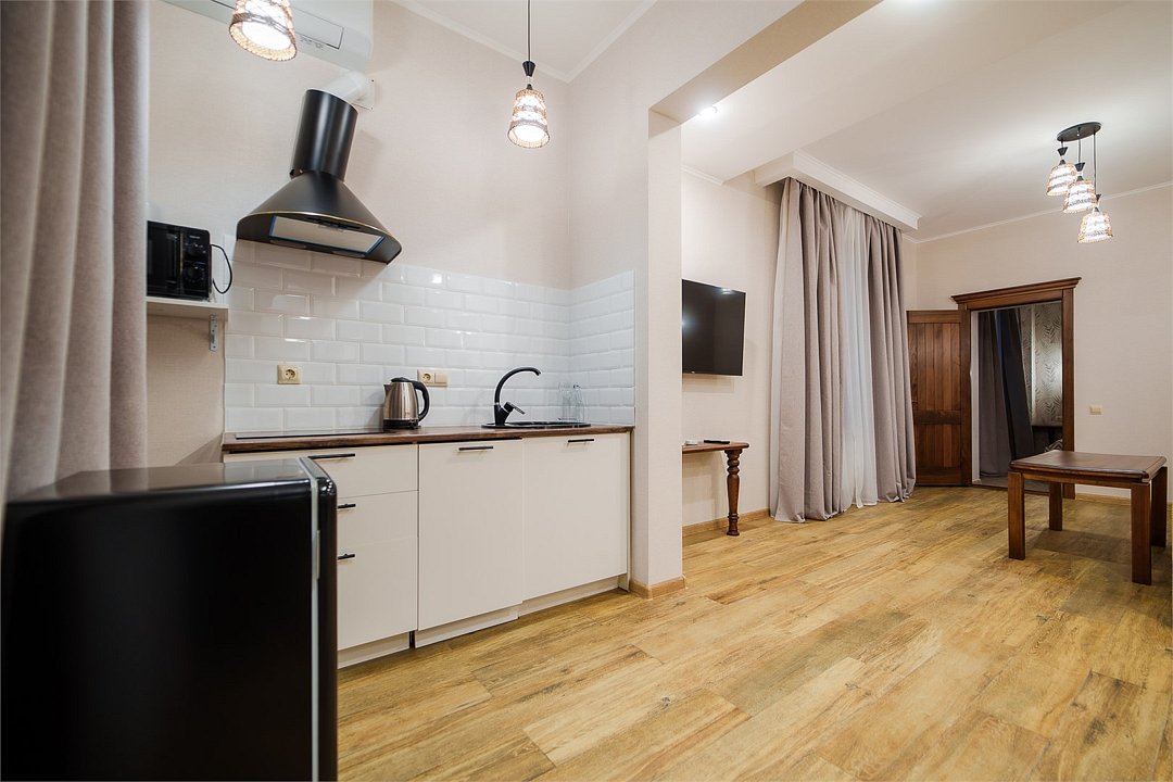телевизор, Wi-Fi, холодильник, фен, электронные замки, ванна или душевая кабина, халаты, пляжные полотенца, тапочки, балкон, двуспальная кровать, стулья, вешалки, письменный стол, обеденный стол, две комнаты, чайный набор, сейф, чайник, унитаз, обеденная зона, гостиная зона, отопление, плиточное покрытие, кухонная посуда, стаканы, кухонная утварь, столовые приборы, стул, туалетные средства, сплит-система, цифровое тв, диван-кровать, раскладной диван, внутренний телефон, кухонный уголок, шкаф-купе, межкомнатная дверь, уборка номера, услуги прачечной (платно), можно с питомцамиВ гостиничном номере