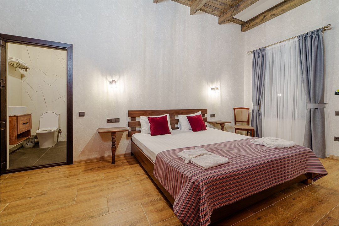 Wi-Fi, холодильник, фен, электронные замки, ванная комната, ванна или душевая кабина, санузел, теплый пол, халаты, пляжные полотенца, тапочки, гигиенические средства, кровать «Queen size», две односпальные или большая двуспальная кровать, шкаф для одежды, обеденный стол, багажная тумба, зеркало, чайник, унитаз, раковина, ковровое покрытие, отопление, душ, плиточное покрытие, вид во двор, высокие потолки, стаканы, стул, стол, туалетный столик, туалетные средства, туалет, сплит-система, мангал, диван-кровать, раскладное кресло, телевизор с плоским экраном, москитная сетка, шкаф-купе, телевизор со Smart TV, теплые полы, кресло-кровать, межкомнатная дверь, уборка номера, вешалки-плечики, навес, мыло, зеркало в полный рост, можно с питомцамиВ гостиничном номере