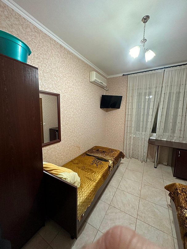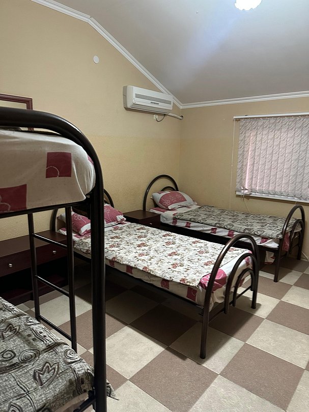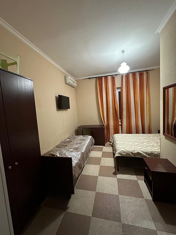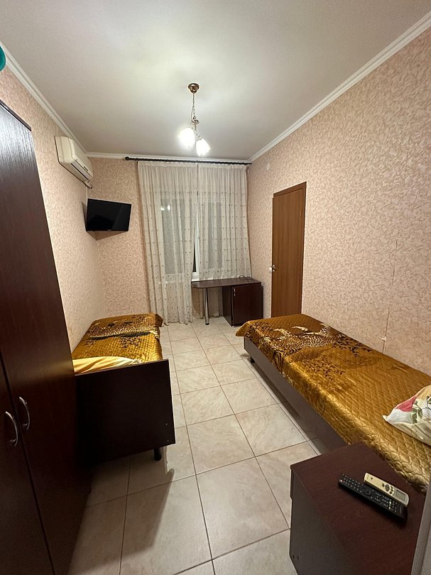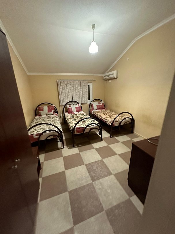 Три односпальные кровати, холодильник, кондиционер, телевизор, санузел общий на этаже