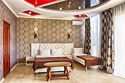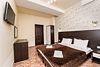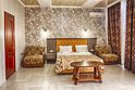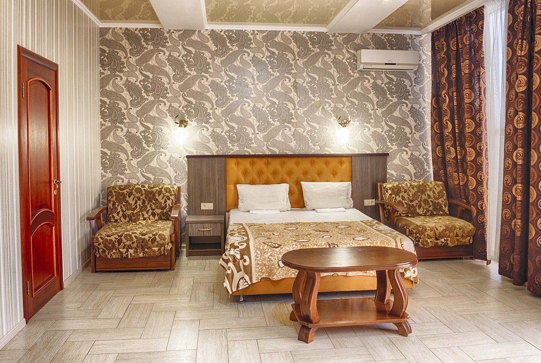 Просторный однокомнатный номер с одной двуспальной или двумя односпальными кроватями, полутороспальной кроватью и двумя раскладными креслами.