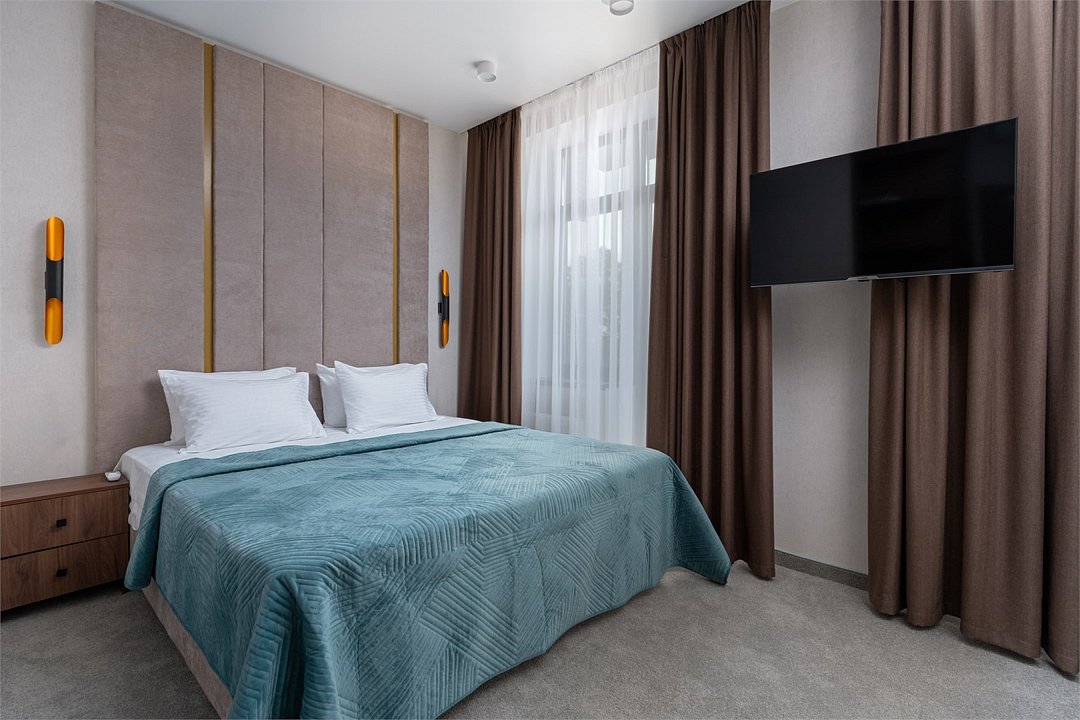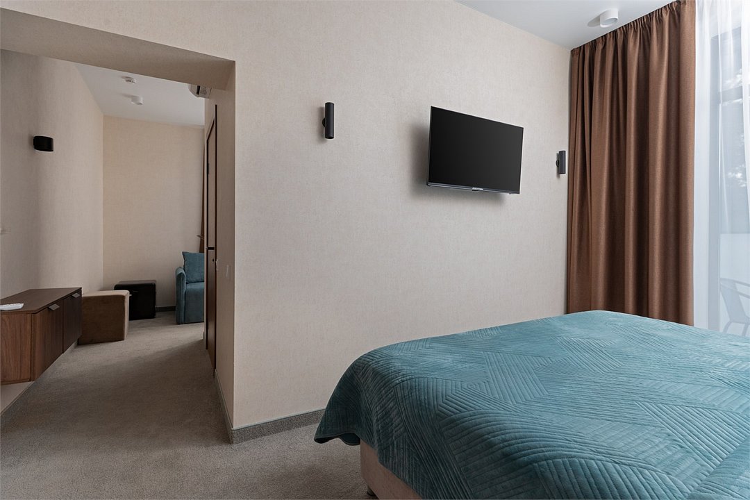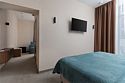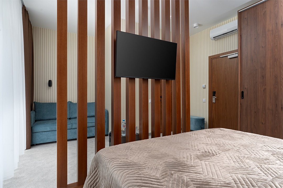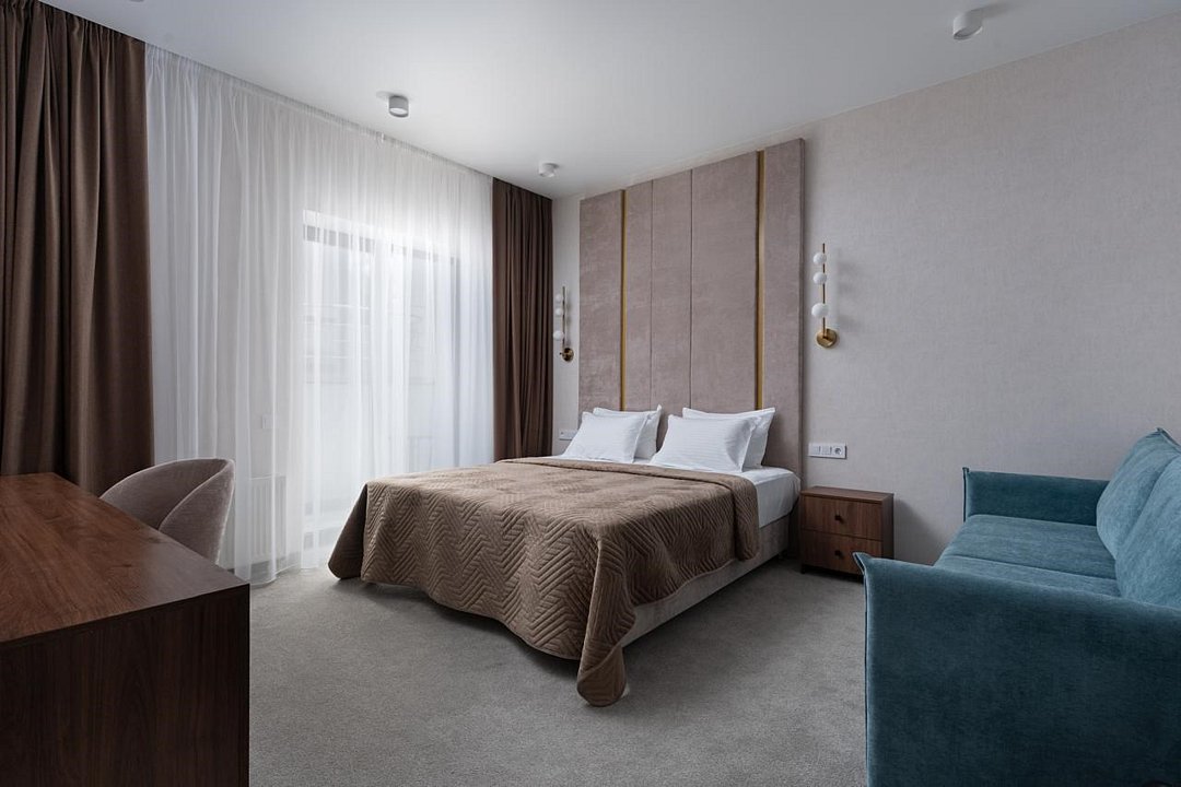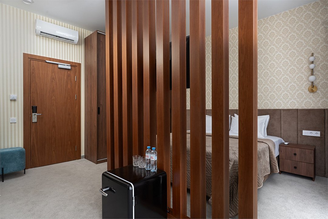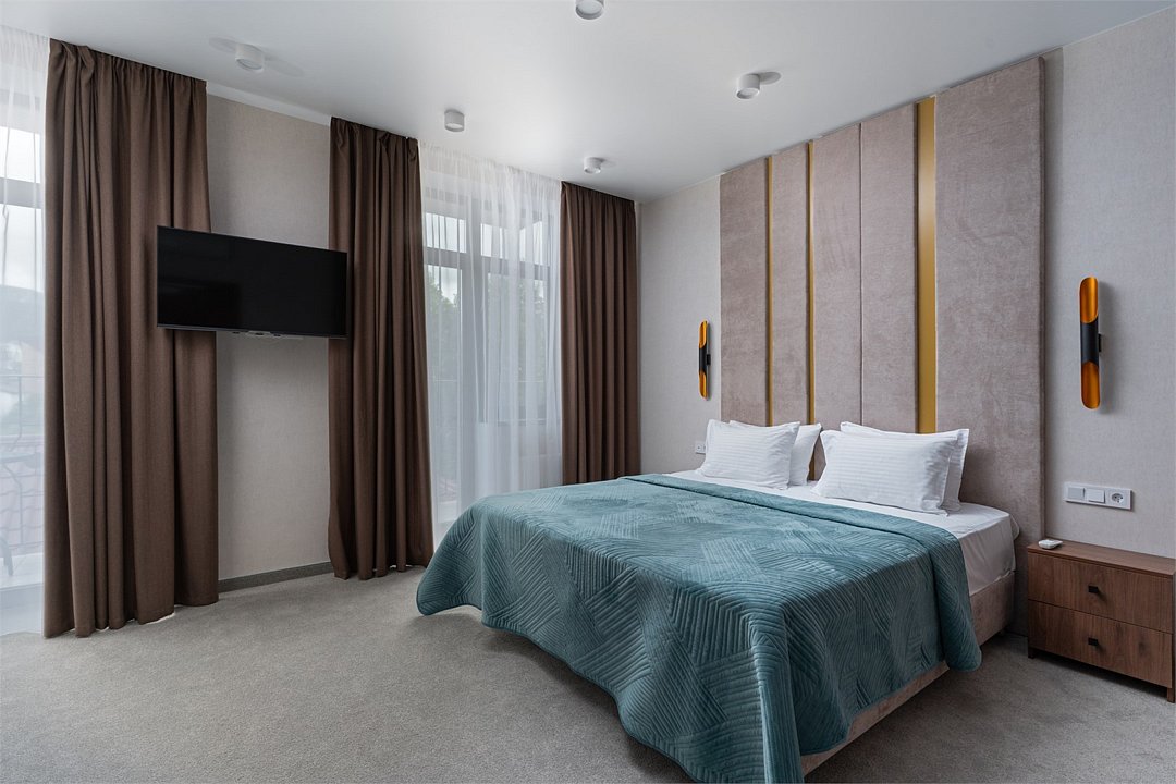 Двухместный двухкомнатный номер с балконом, расположен с 1 по 4 этаж. В номере: двуспальная кровать, телевизор, мини-бар (без наполнения), сплит-система, сейф, шкаф для одежды, wi-fi. В номерах есть дополнительное место для 1 человека - диван. В ванной: душевая кабина, зеркало с подсветкой, набор полотенец, косметические и гигиенические принадлежности, халат, фен, тапочки.Услуги и удобства