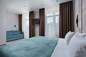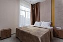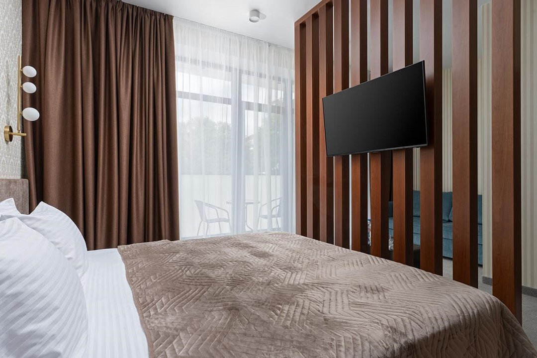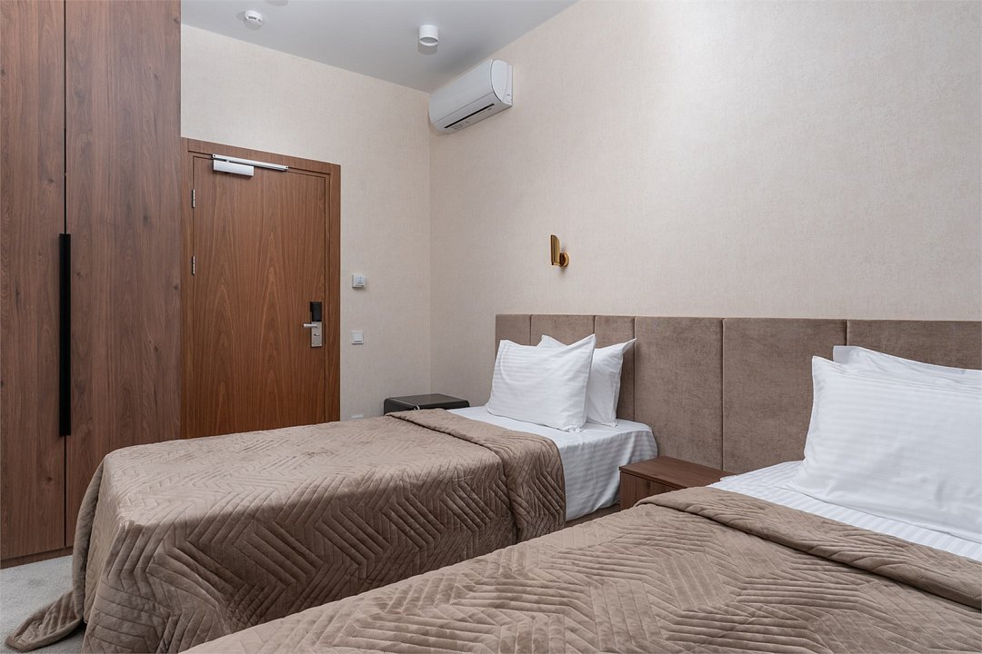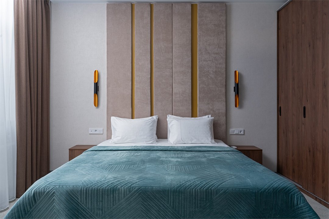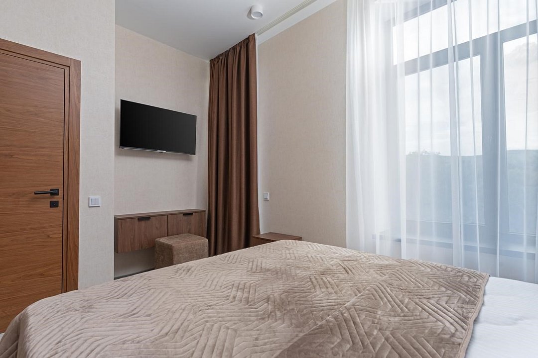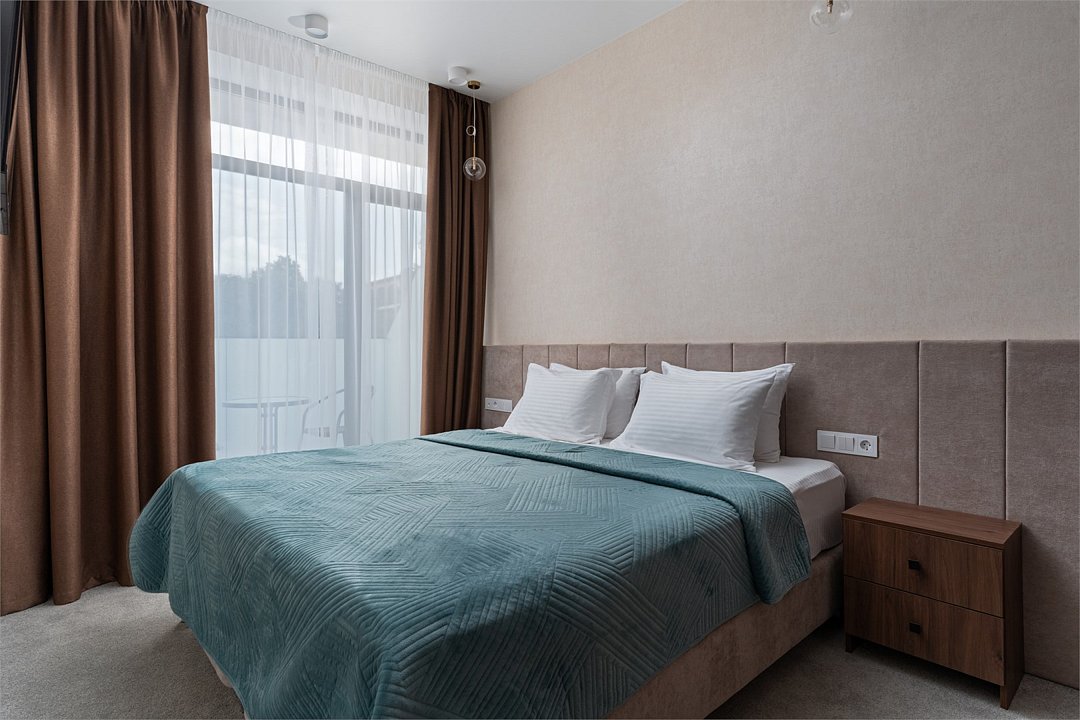 Двухместный двухкомнатный номер с балконом, расположен с 1 по 4 этаж. В номере: двуспальная кровать, телевизор, мини-бар (без наполнения), сплит-система, сейф, шкаф для одежды, wi-fi. В номерах есть дополнительное место для 1 человека - диван. В ванной: душевая кабина, зеркало с подсветкой, набор полотенец, косметические и гигиенические принадлежности, халат, фен, тапочки.Услуги и удобства