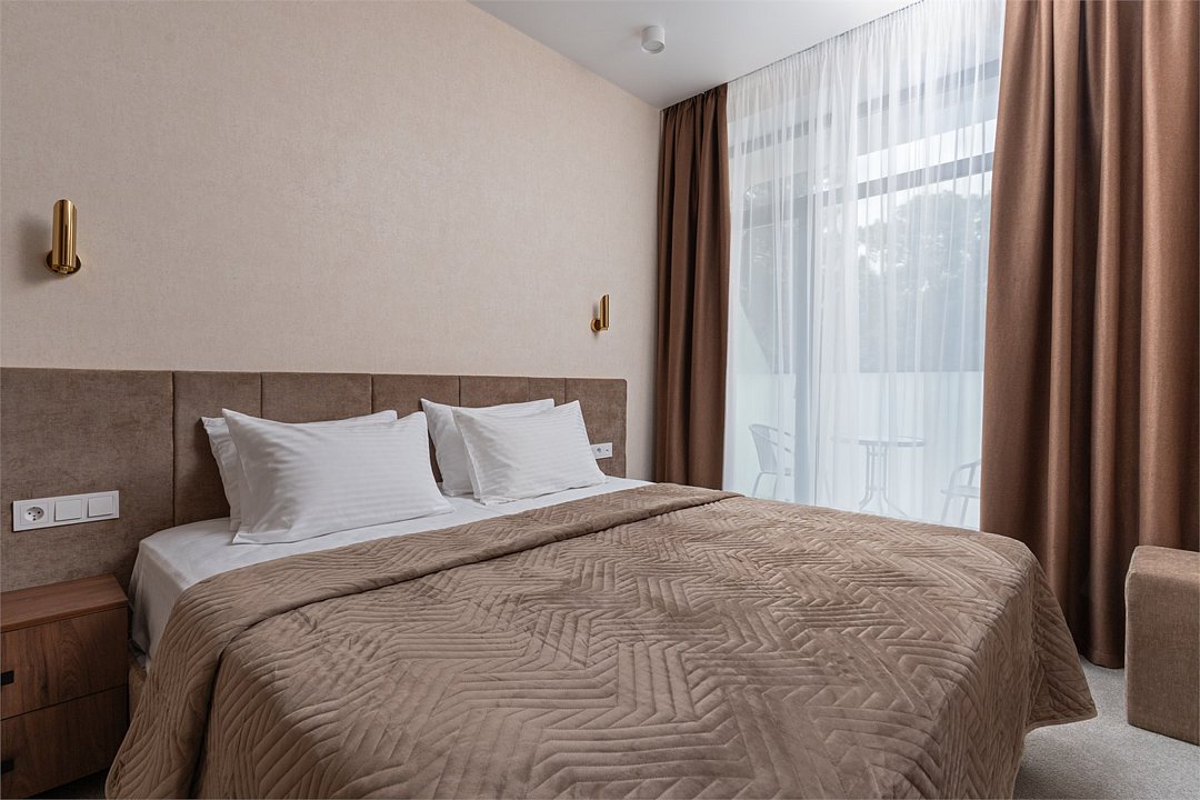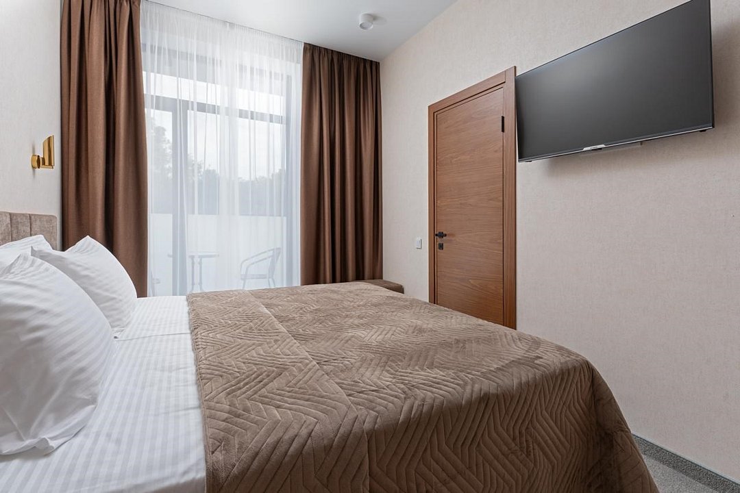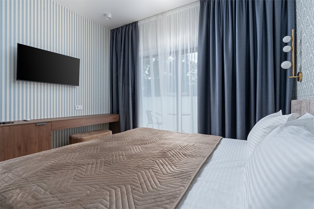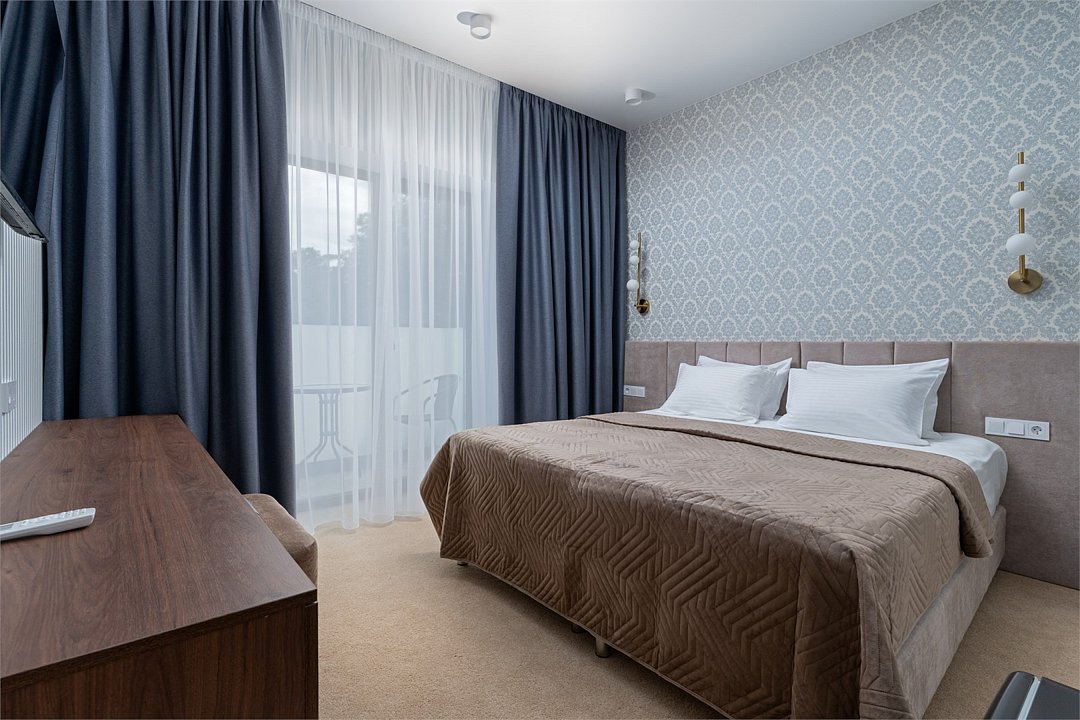 Двухместный однокомнатный номер с балконом, расположен на 1 этаже. В номере: двуспальная кровать, односпальный диван, телевизор, мини-бар (без наполнения), сплит-система, сейф, шкаф для одежды, wi-fi. В ванной: душевая кабина, зеркало с подсветкой, набор полотенец, косметические и гигиенические принадлежности, халат, фен, тапочки.Услуги и удобства
